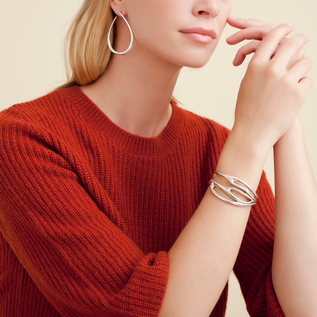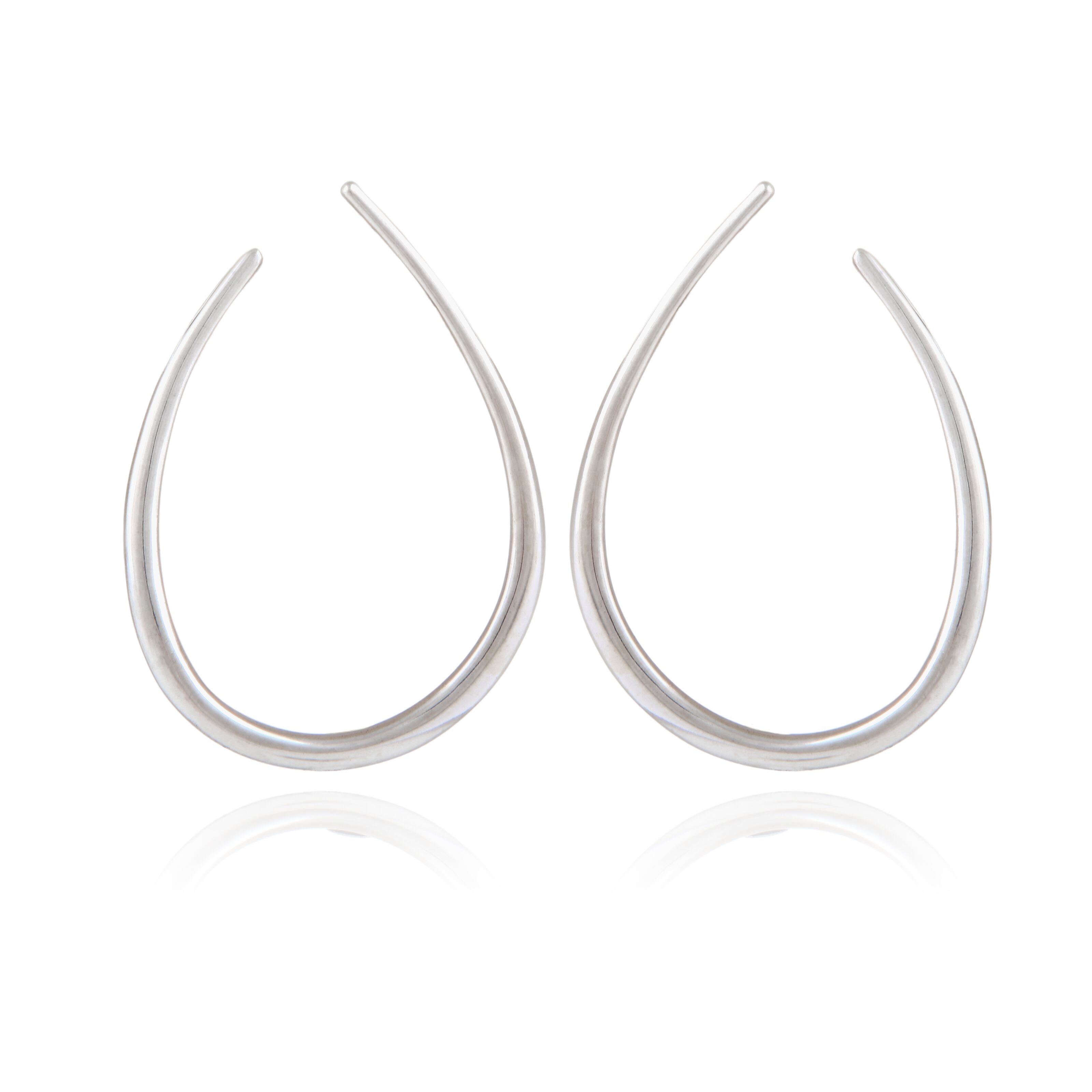 つるんとした質感の大人なフープピアス。 輪っかが正面にくるようなデザインで珍しさもあります。 ポスト部はシルバー、それ以外はシルバーコーティングです。 長さ約5.2cm