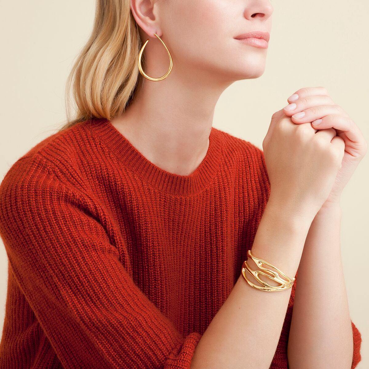 つるんとした質感の大人なフープピアス。 輪っかが正面にくるようなデザインで珍しさもあります。 ポスト部はシルバーにゴールドコーティング、それ以外は真鍮にゴールドコーティングです。 長さ約5.2cm