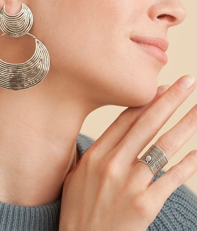 滑らかな波を描くリング。 上下裏表どちら向きにでも着用できます。 サイズ調節可能。 シルバーコーティング。 幅約1.5cmです。