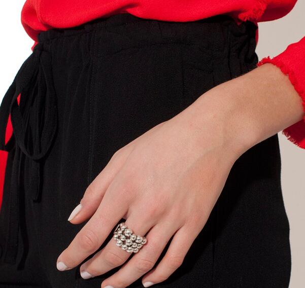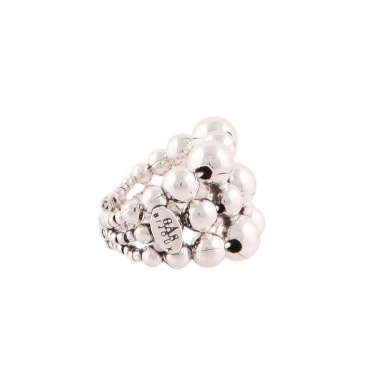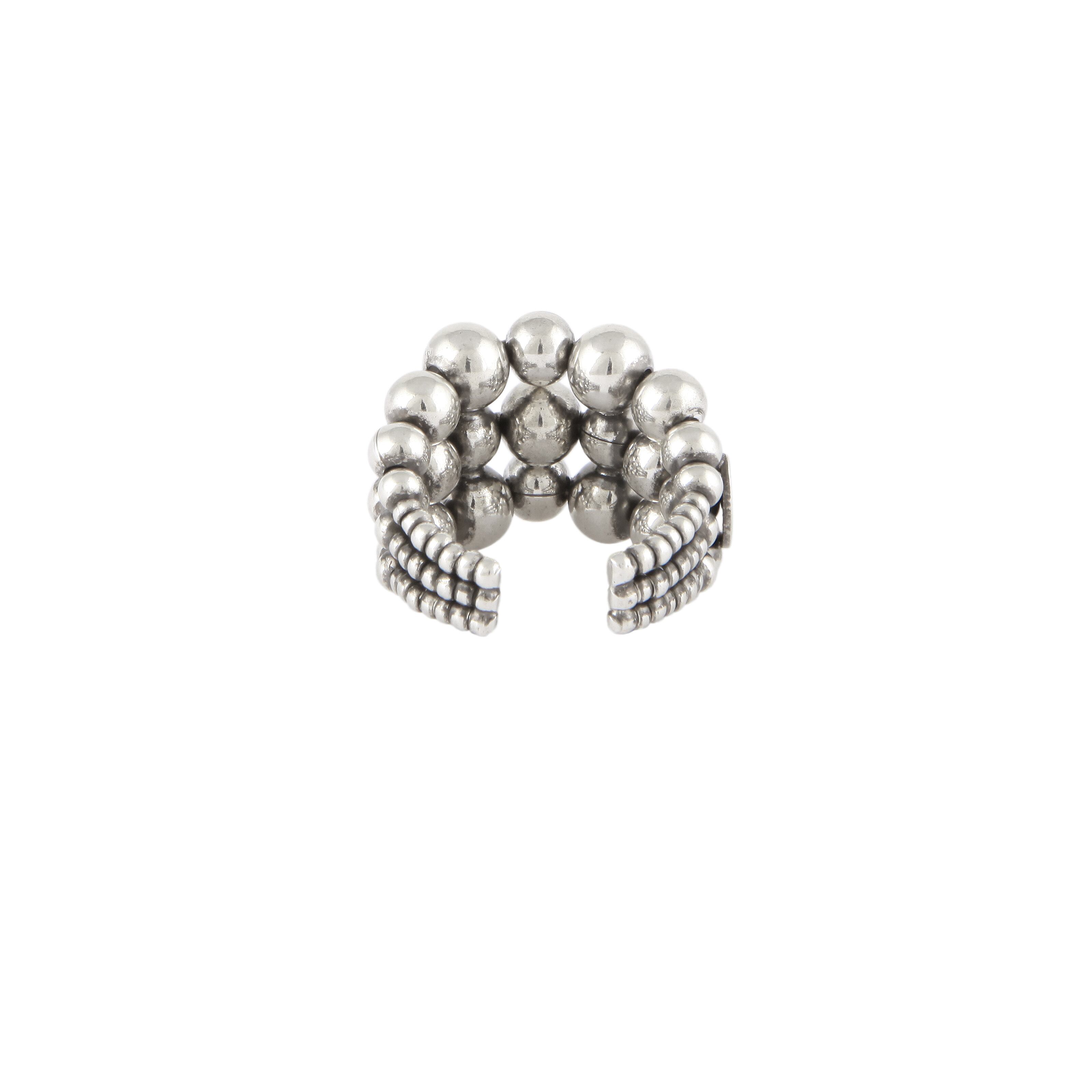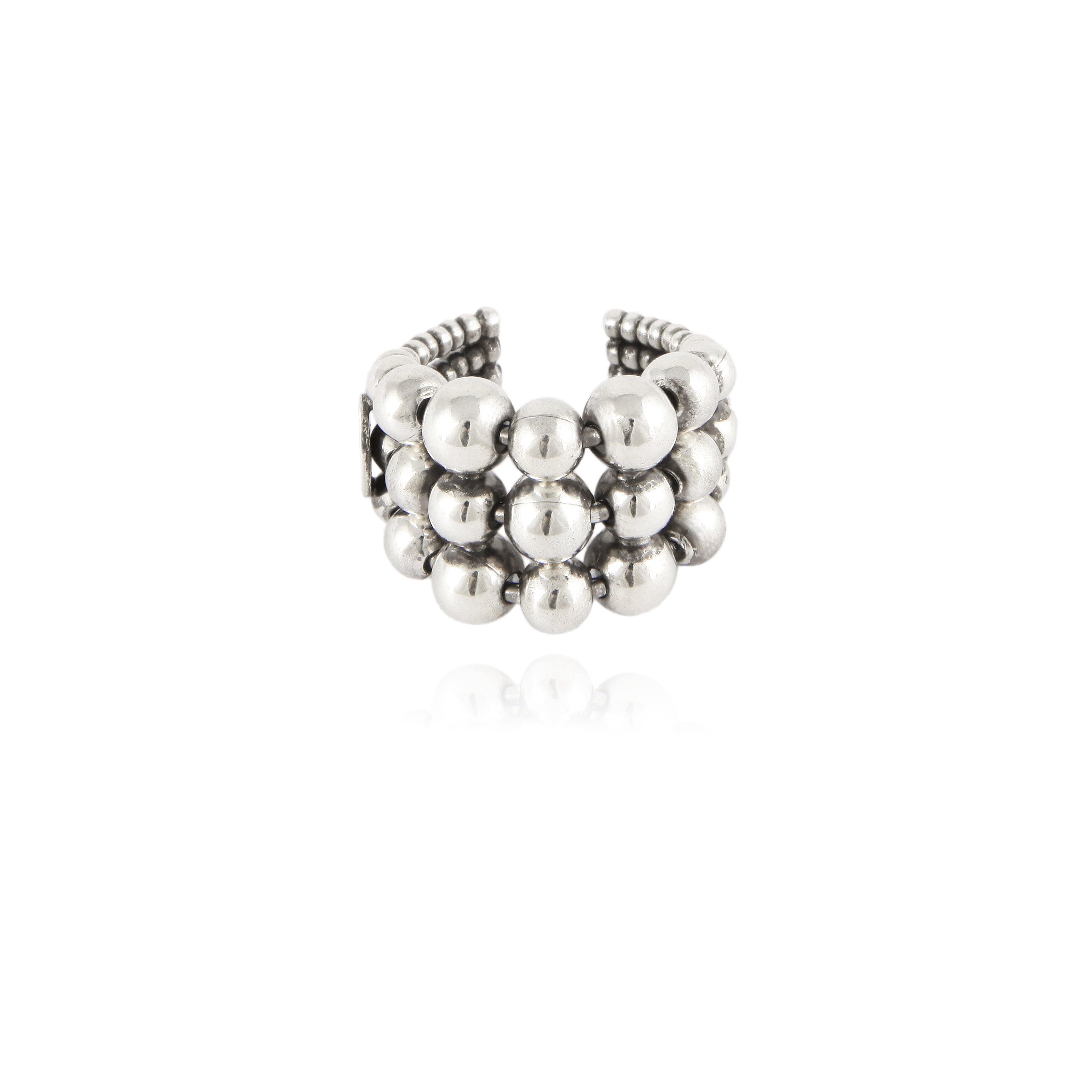 小さいボールが集まった存在感のあるリング。 シンプルなコーディネートの時などにも活躍します。 サイズ調節可能。 シルバーコーティング。