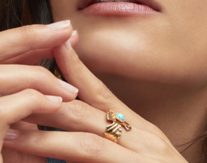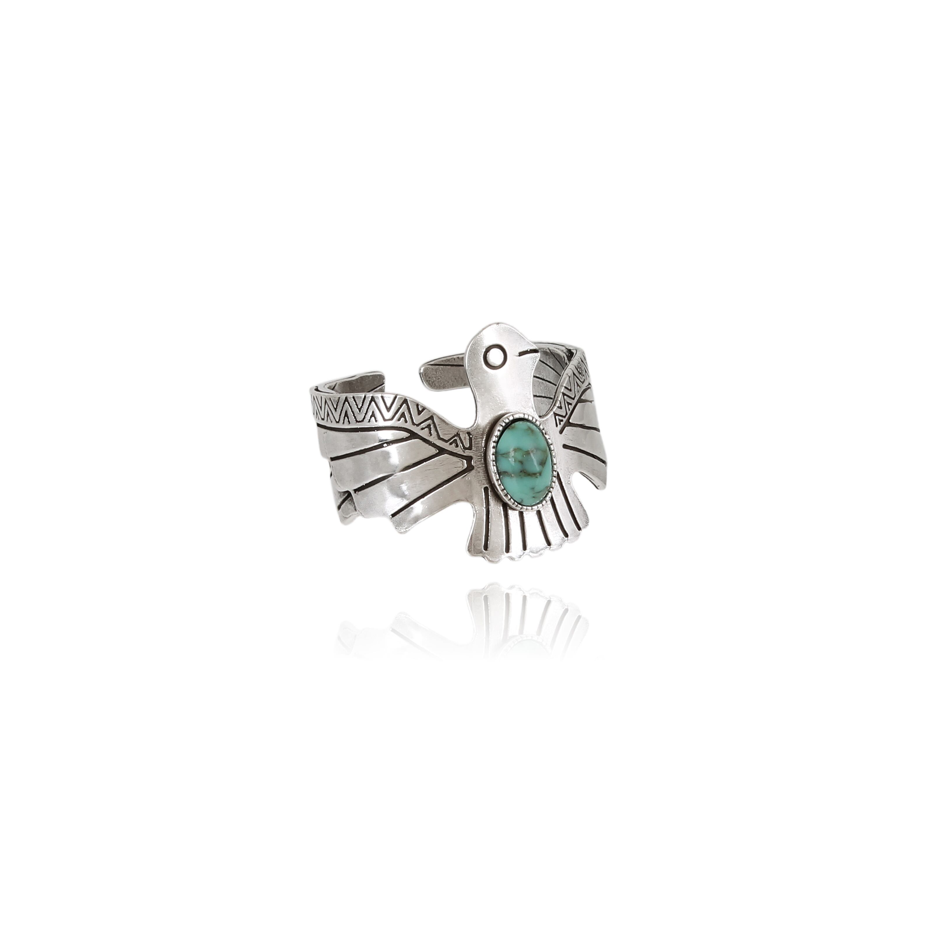 女性らしさがあるネイティブ調のリング。 薄づきで指にぴったりと収まります。 イーグルにターコイズストーンが埋め込まれています。 シルバーコーティング。 サイズは簡単に調節していただけます。 同シリーズのピアスと合わせるとさらに素敵です。 幅最長部1.6cm ※着用画像の色味は異なります。