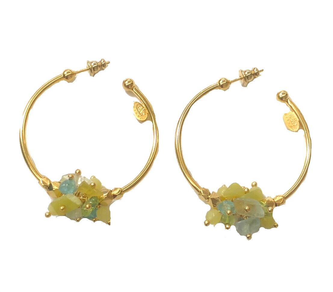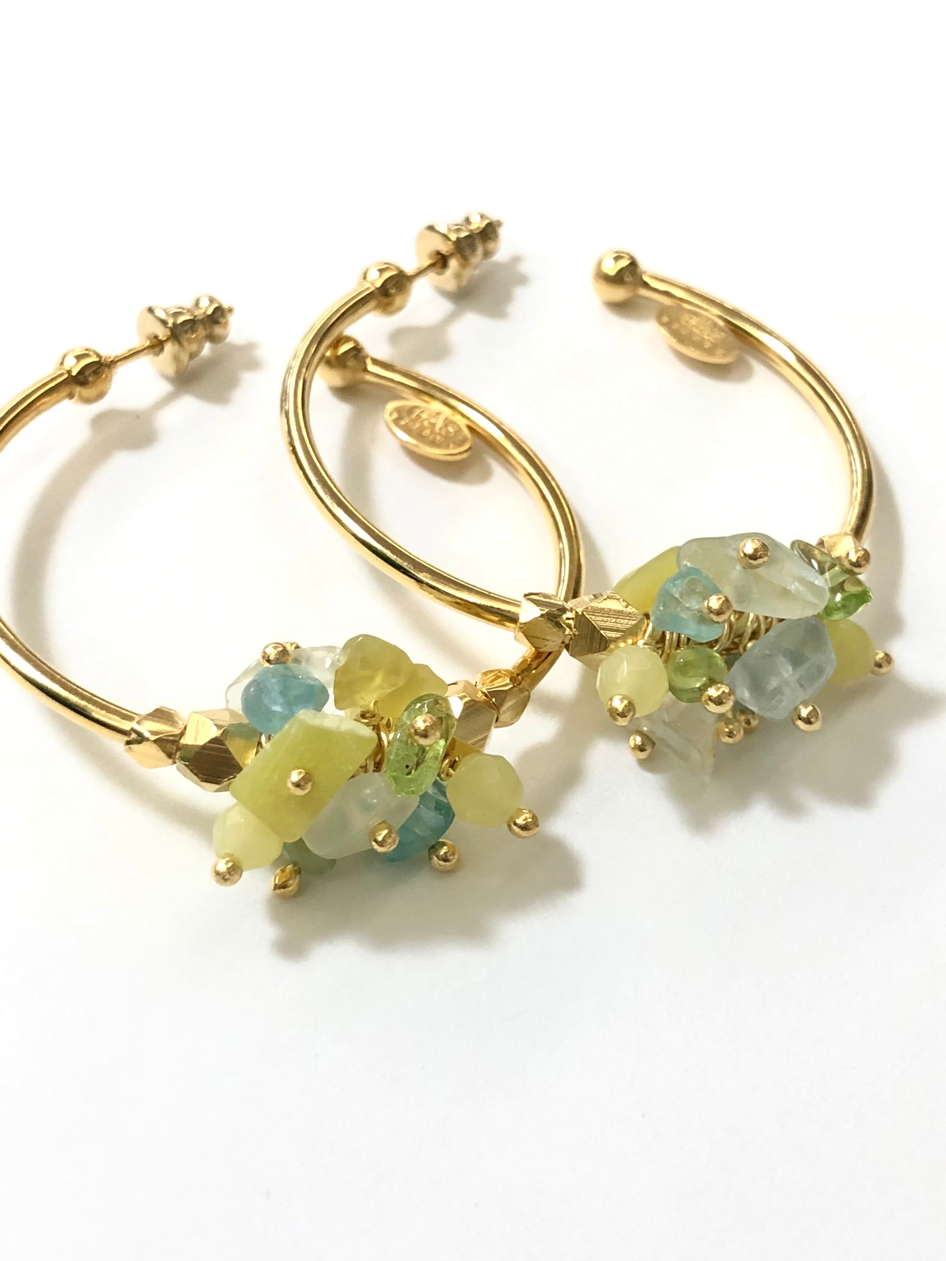 イエローグリーンブルー系の小さな天然石が集まった美しいフープピアス。 ポストはシルバーに24金、それ以外は真鍮に24金コーティングです。 直径約4センチです。 ※着用画像の色味は異なります。