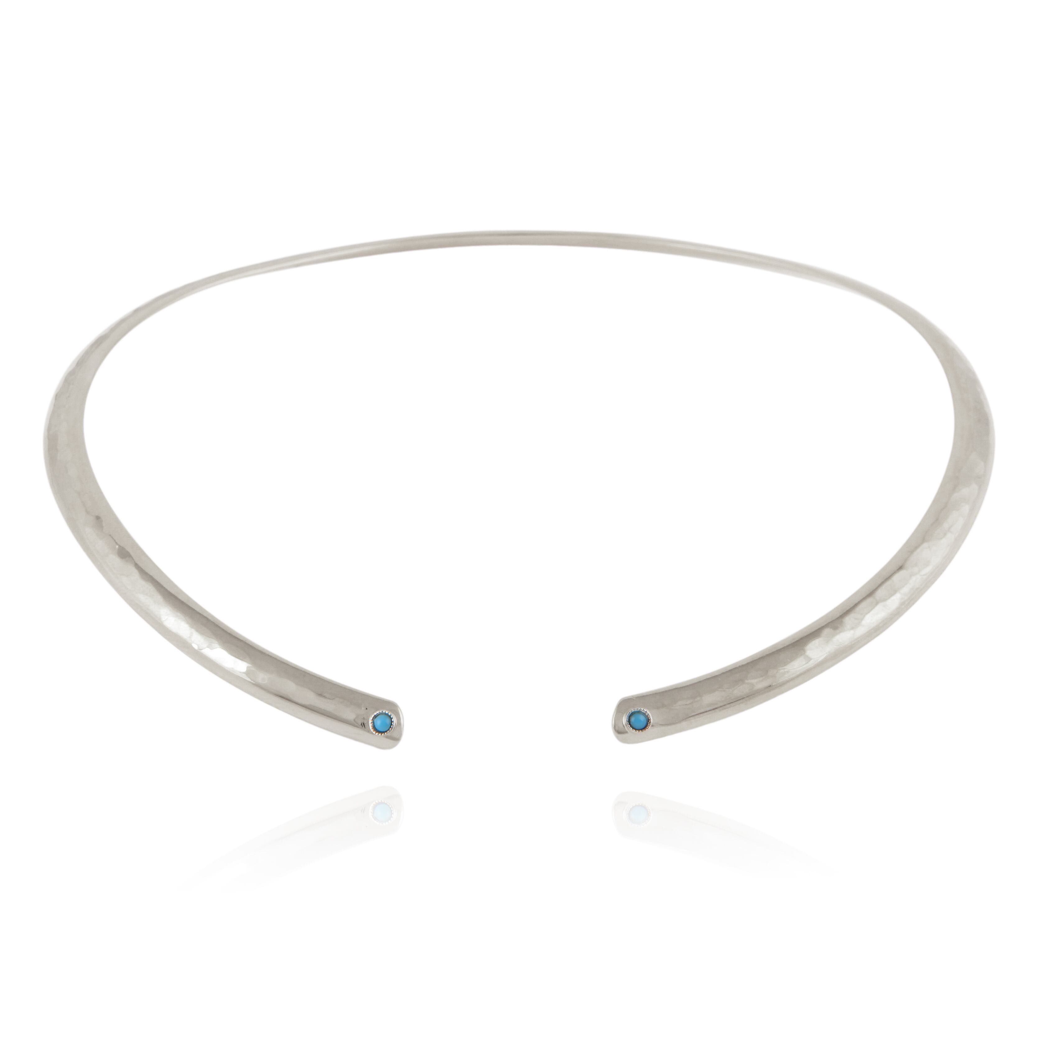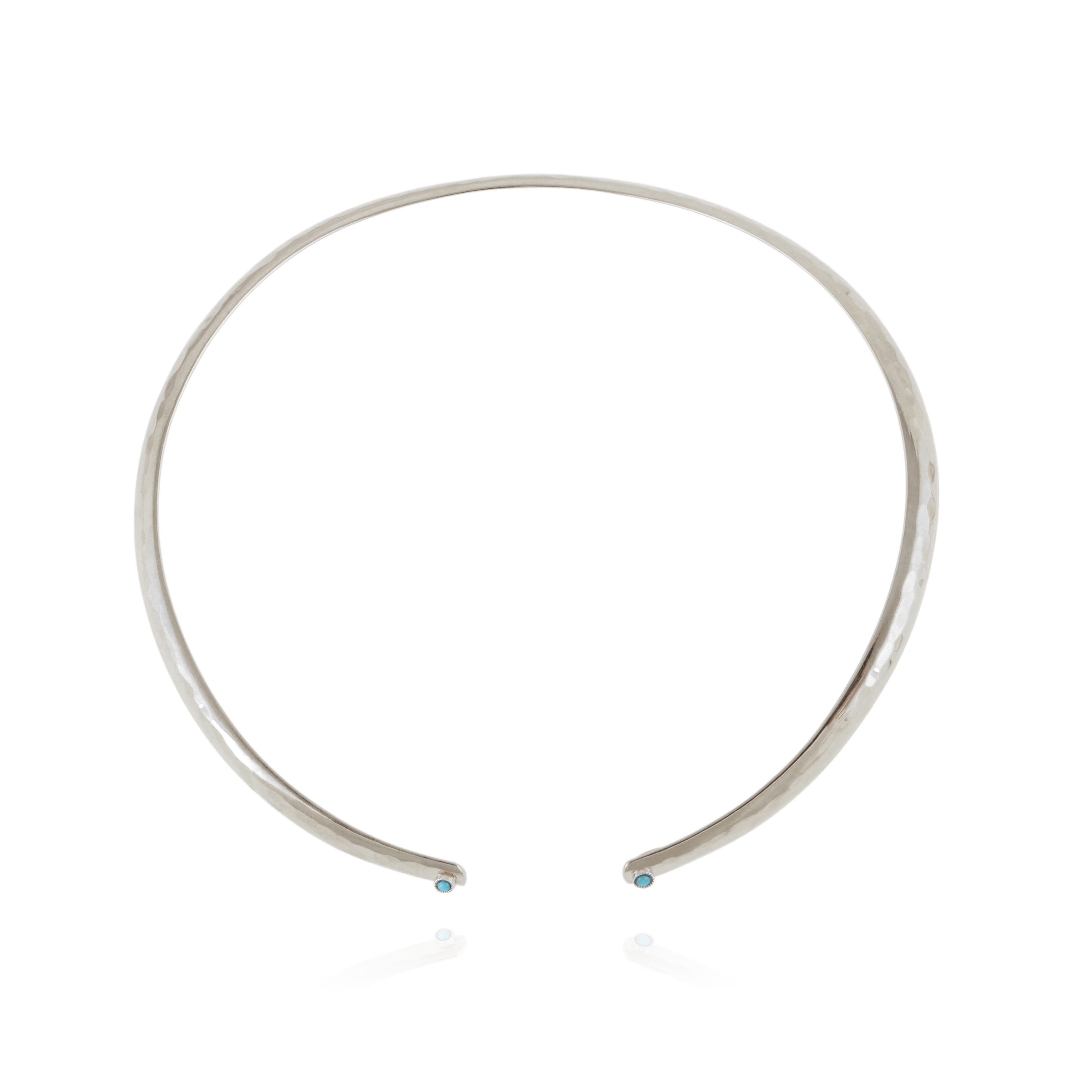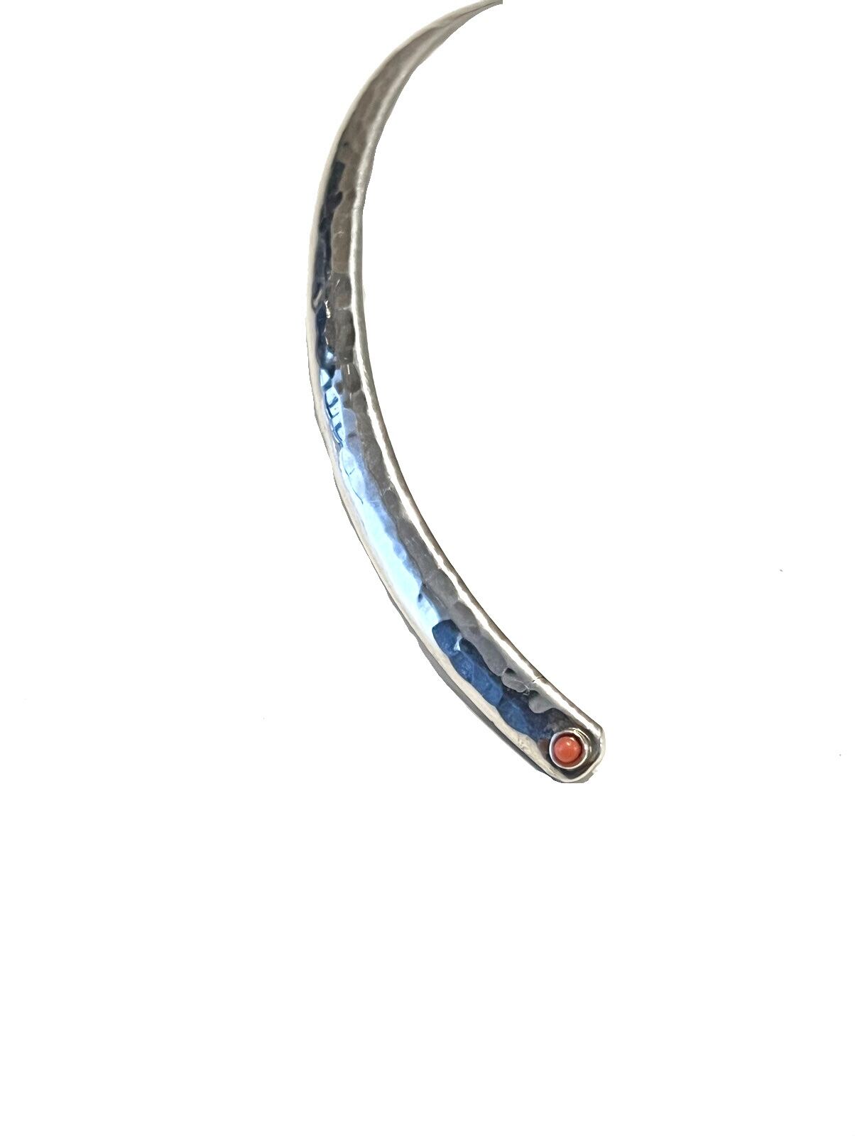 前後どちらでもお好きに着けられます。 艶感のあるシルバーチョーカーネックレスに打ち加工が施されています。 両サイド先端にオレンジのストーンが付いています。(画像3) 柔らかく開くので着脱も簡単です。