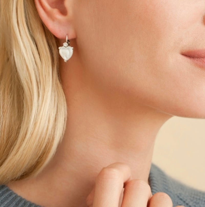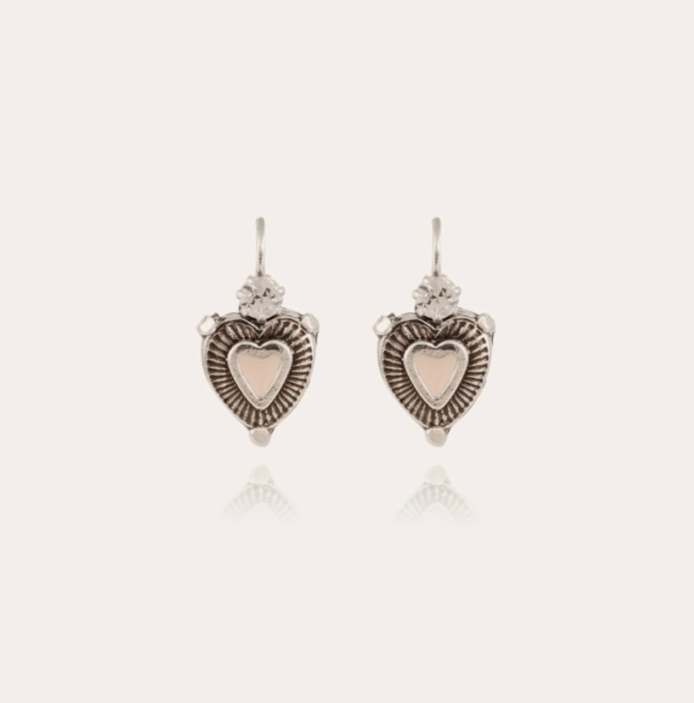 爪留めと彫りがクールな印象のミニサイズハートピアス。 ワンタッチタイプのピアスで片手で簡単に付けられます。 トップにスワロフスキー、中央はエナメル、その他は真鍮にシルバーコーティングです。 着画は他カラーとなります。 長さ約1.5cm