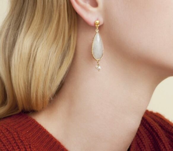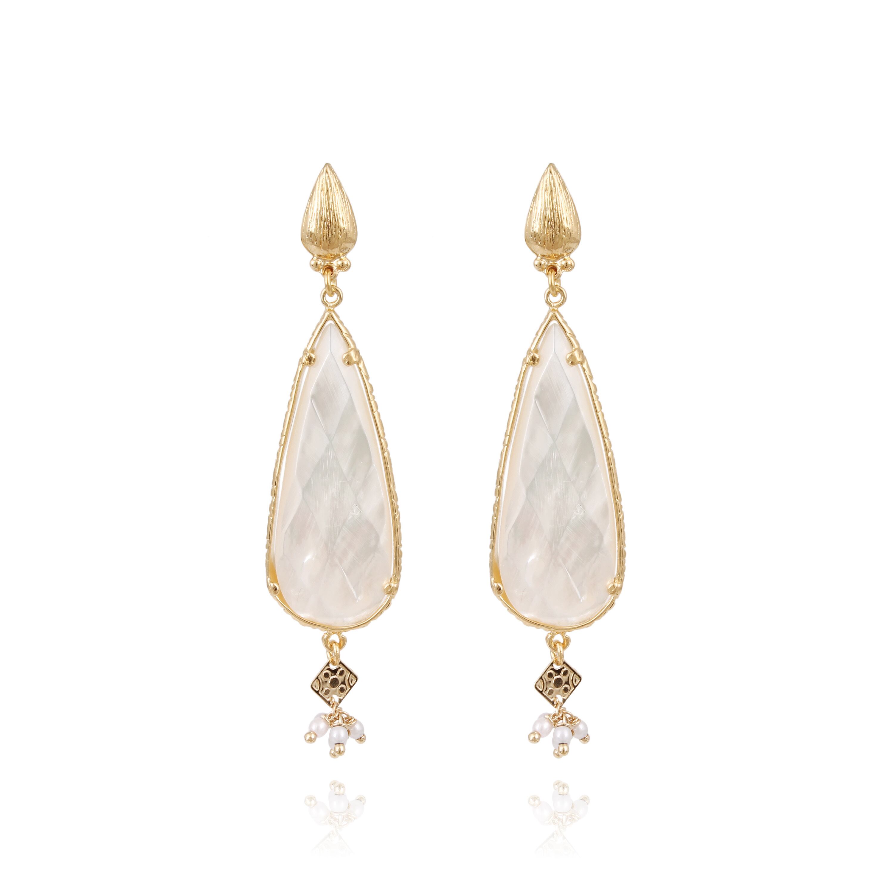 美しくカットされた白蝶貝のピアスです。 角度によって虹色に輝きます。 下についたビーズとパールが可愛く揺れます。 ポストはシルバーに24金、その他は真鍮に24金コーティングです。 全長約4.5cm 幅約1cm