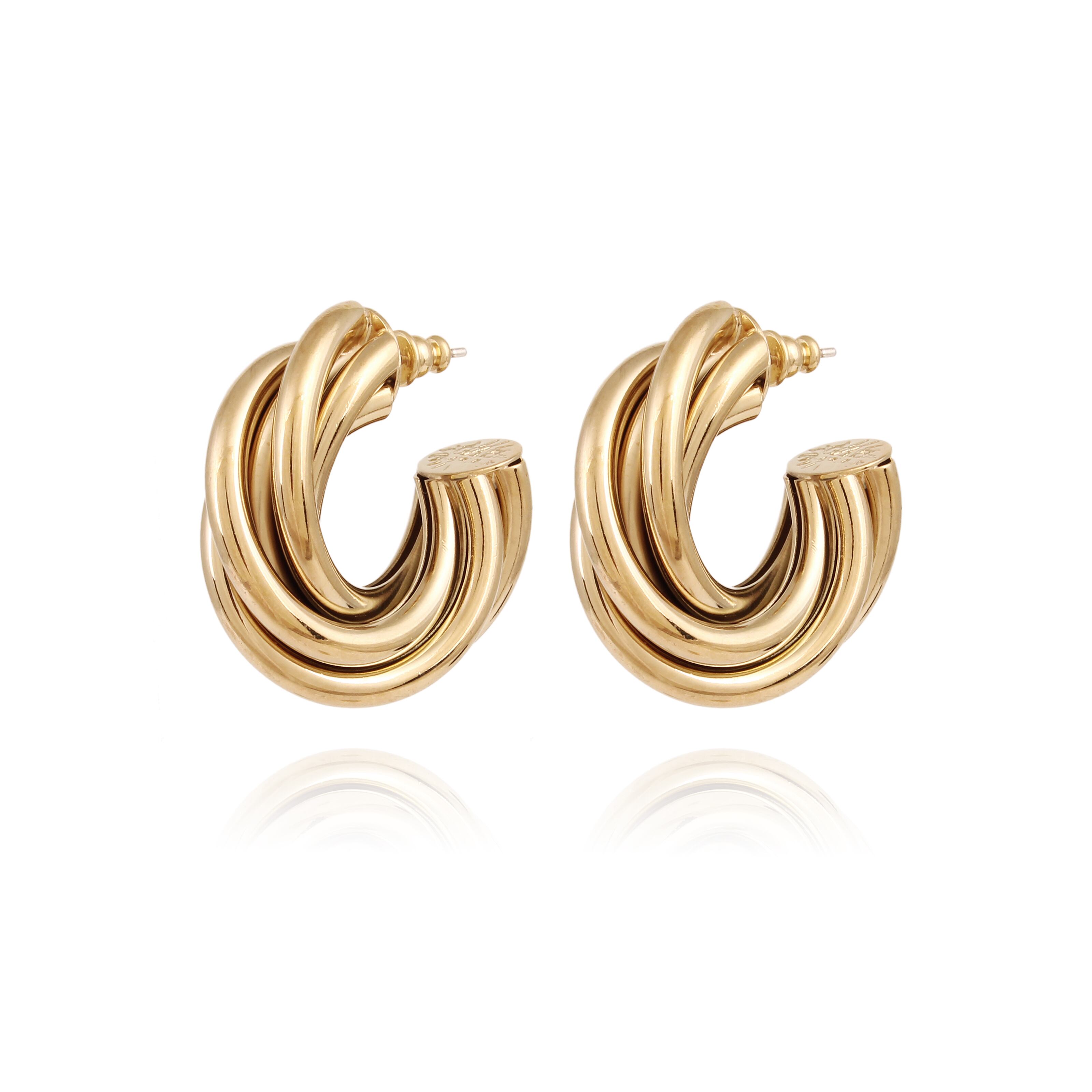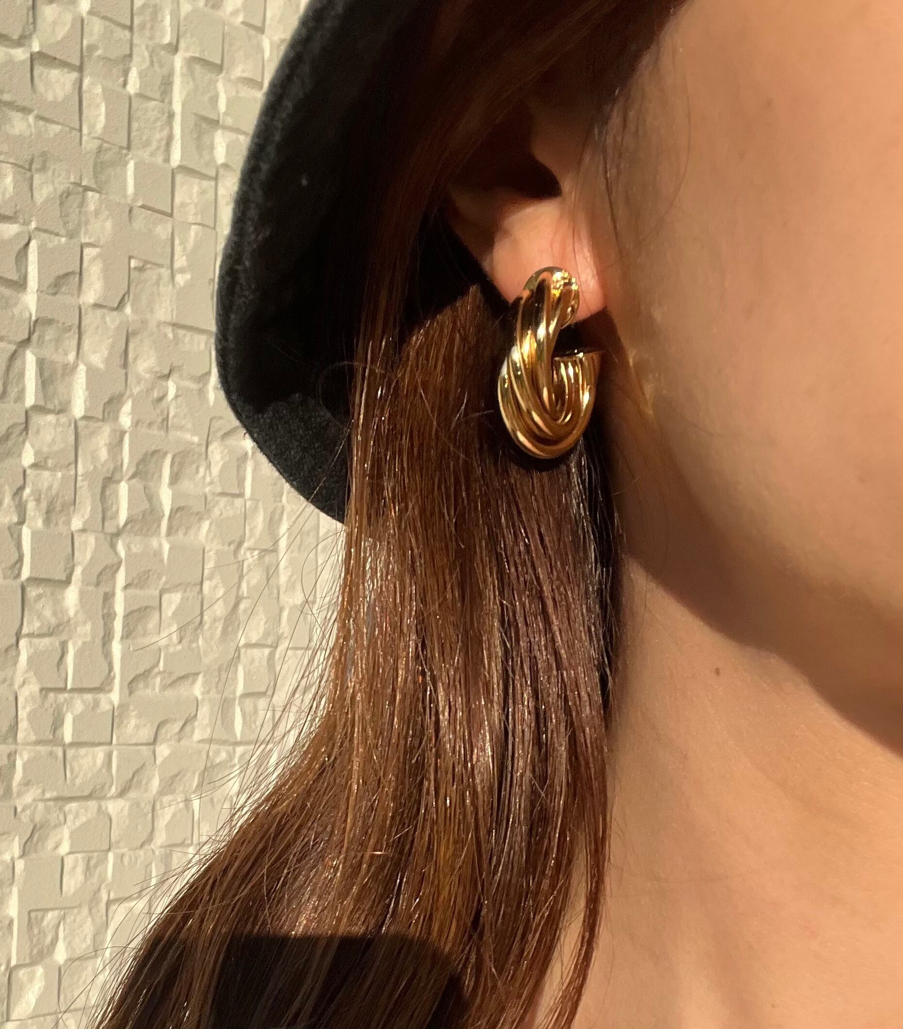 流れるようなねじれが上品なフープピアス。 直径2.7cm ポストはシルバーに24金、その他は真鍮に24金コーティングです。