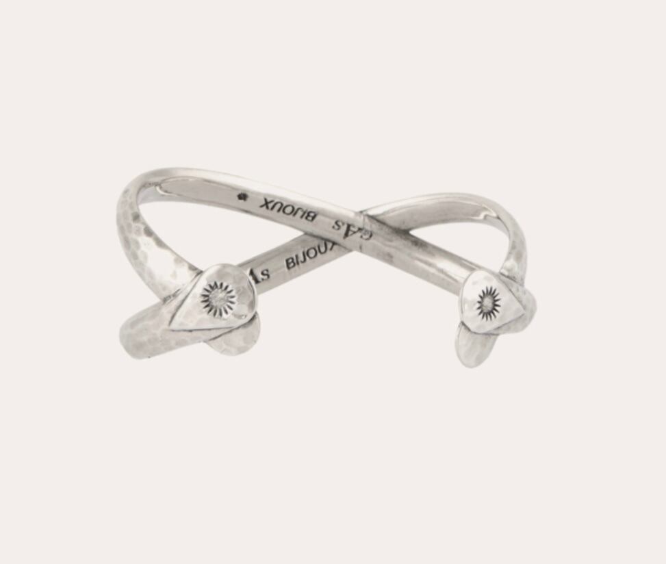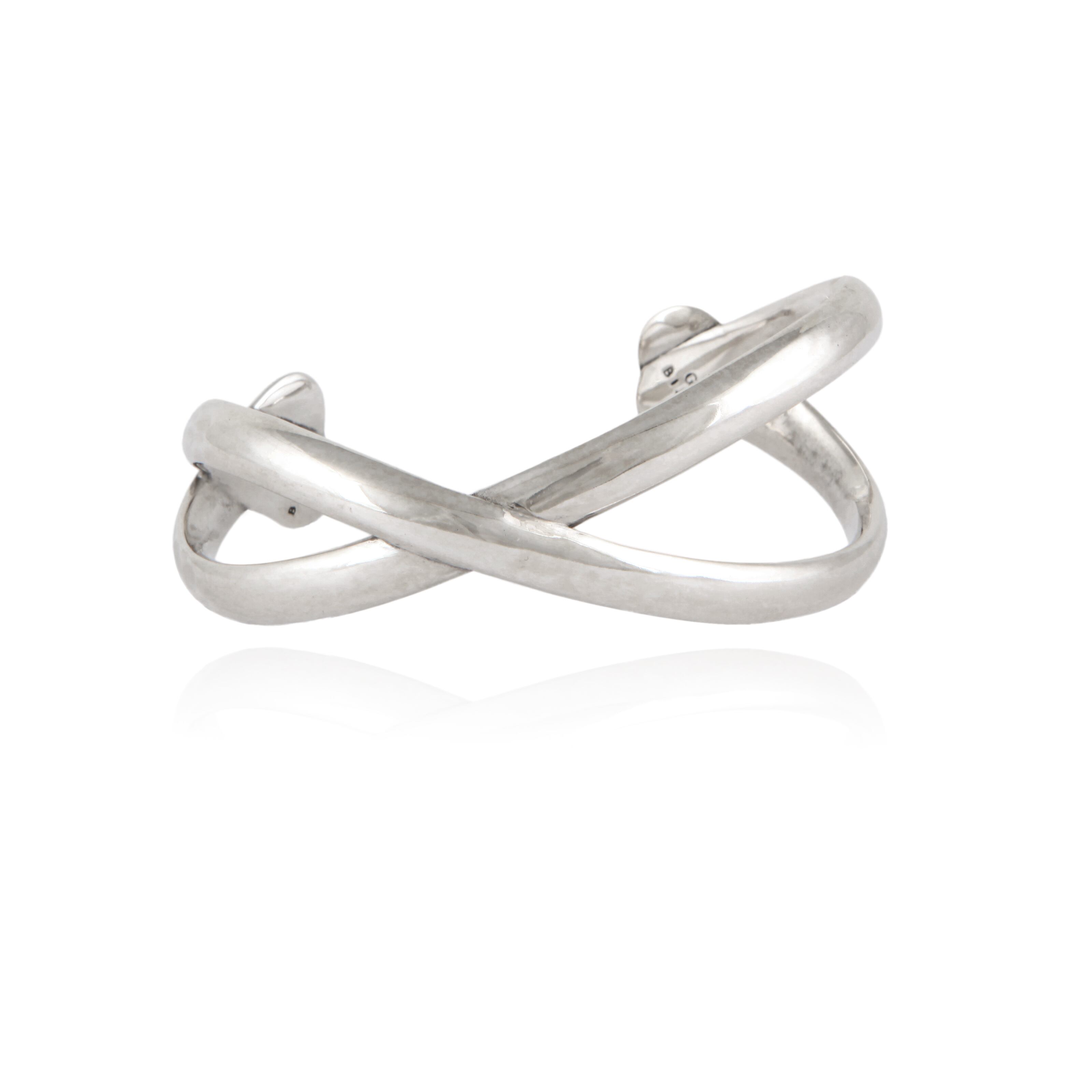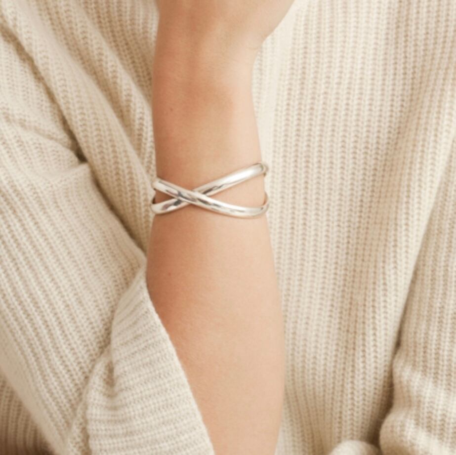 つるんとした上品なクロスバングルです。 サイズ感は若干調節可能です。 真鍮に厚みのあるシルバーコーティング。 全長14cm