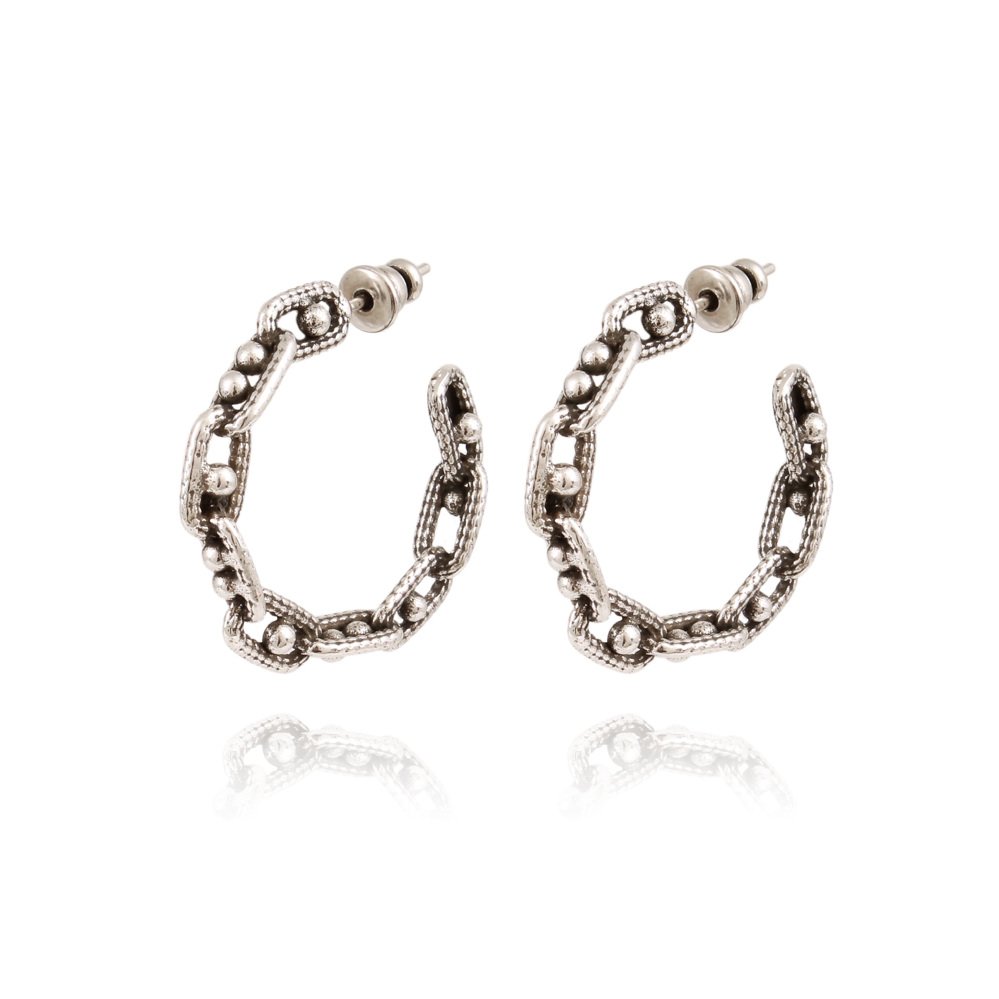 チェーンが連なったようなデザインのフープピアス。 どんなスタイルにも合わせやすいです。 ポストはシルバー、その他は真鍮にシルバーコーティング。 直径3cm