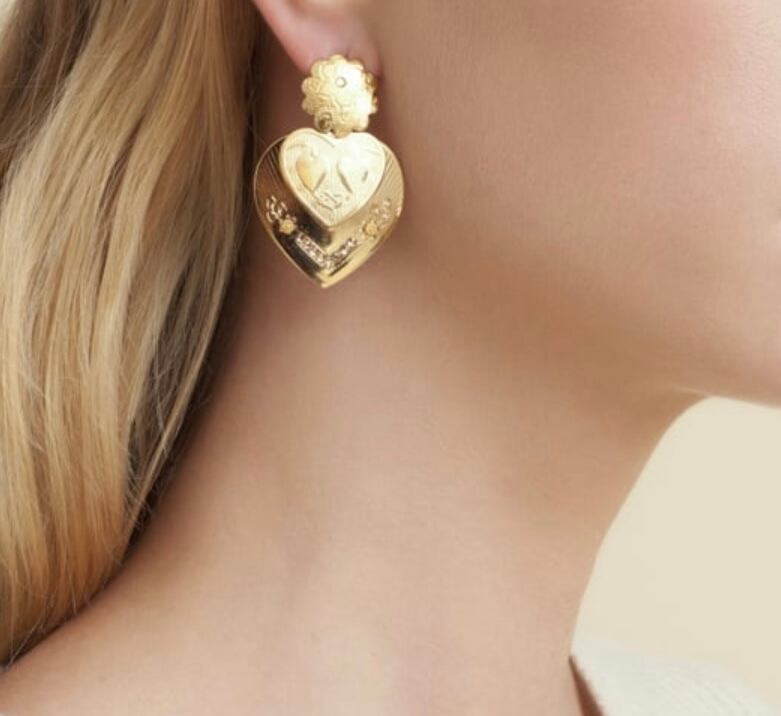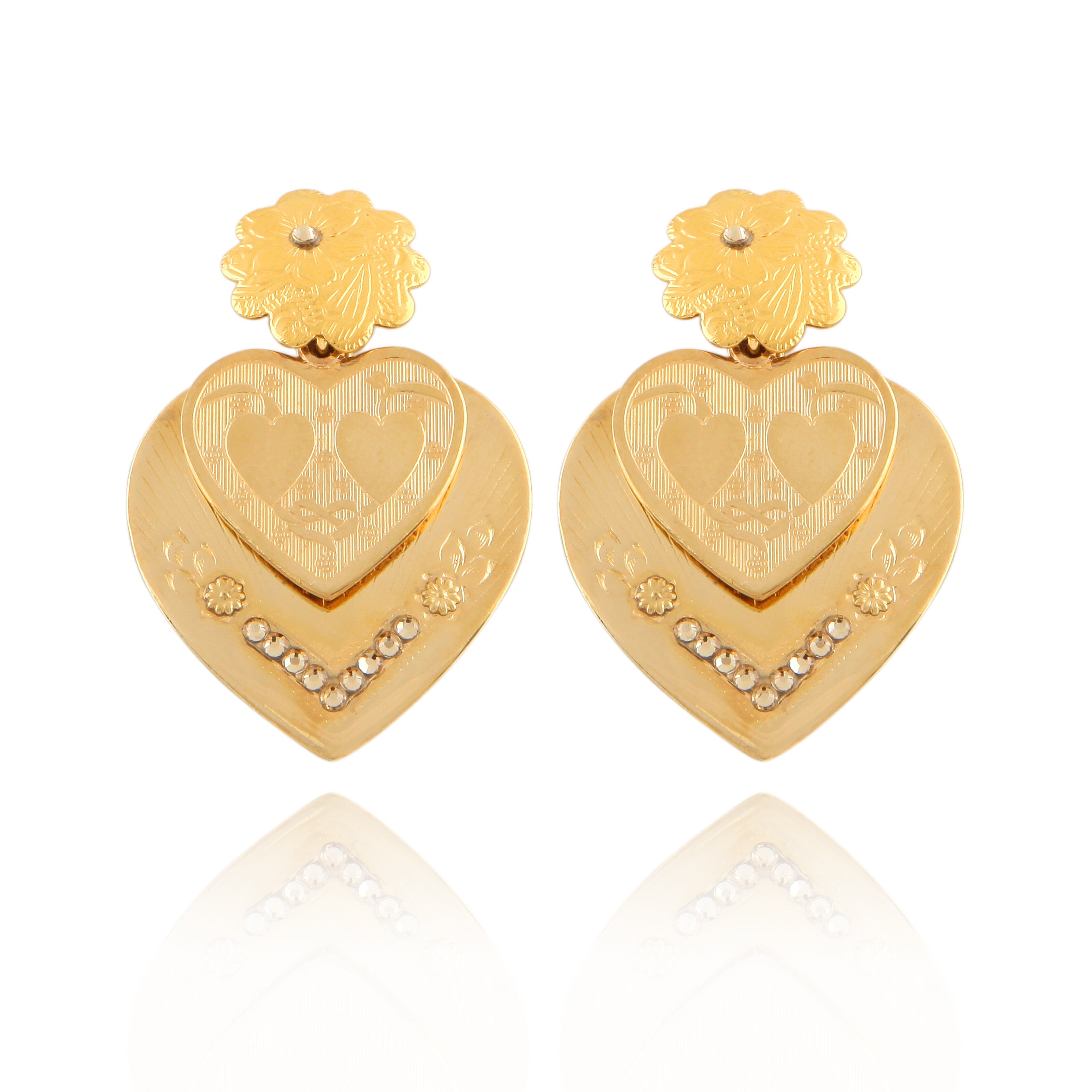 人気のハートコレクションの大きいサイズのピアスです。 異なるデザインのハートが重なり、トップはお花のようなデザイン。 細部のディテールが可愛いピアスです。 スワロフスキーが所々に施されています。 ポストはシルバーに24金コーティング、その他は真鍮に24金コーティングです。