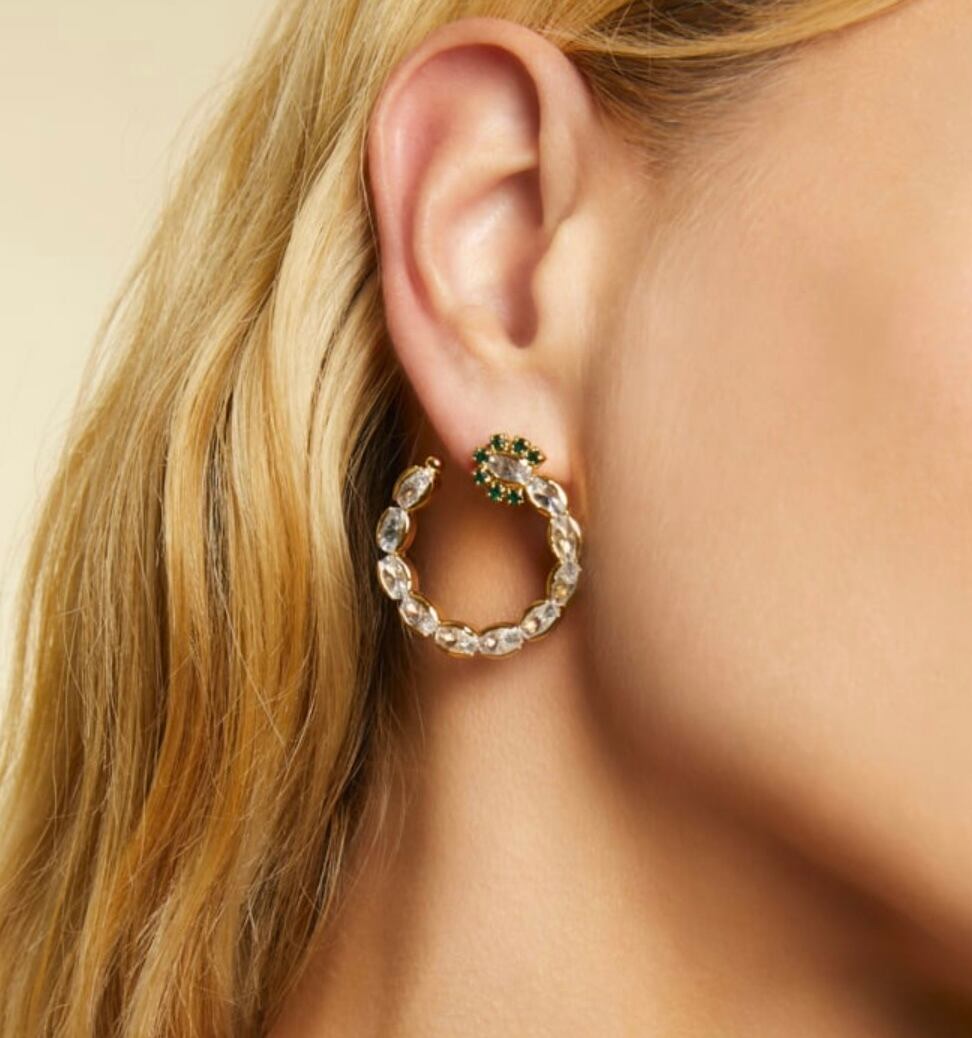きらりと光る透明感のあるストーンが美しいピアスです。 ドレスアップしたコーディネートでも、シンプルなコーディネートで主役アイテムにも。 ポストはシルバーに24金、その他は真鍮に24金です。 着用画像は別カラーとなります。 直径約3cm