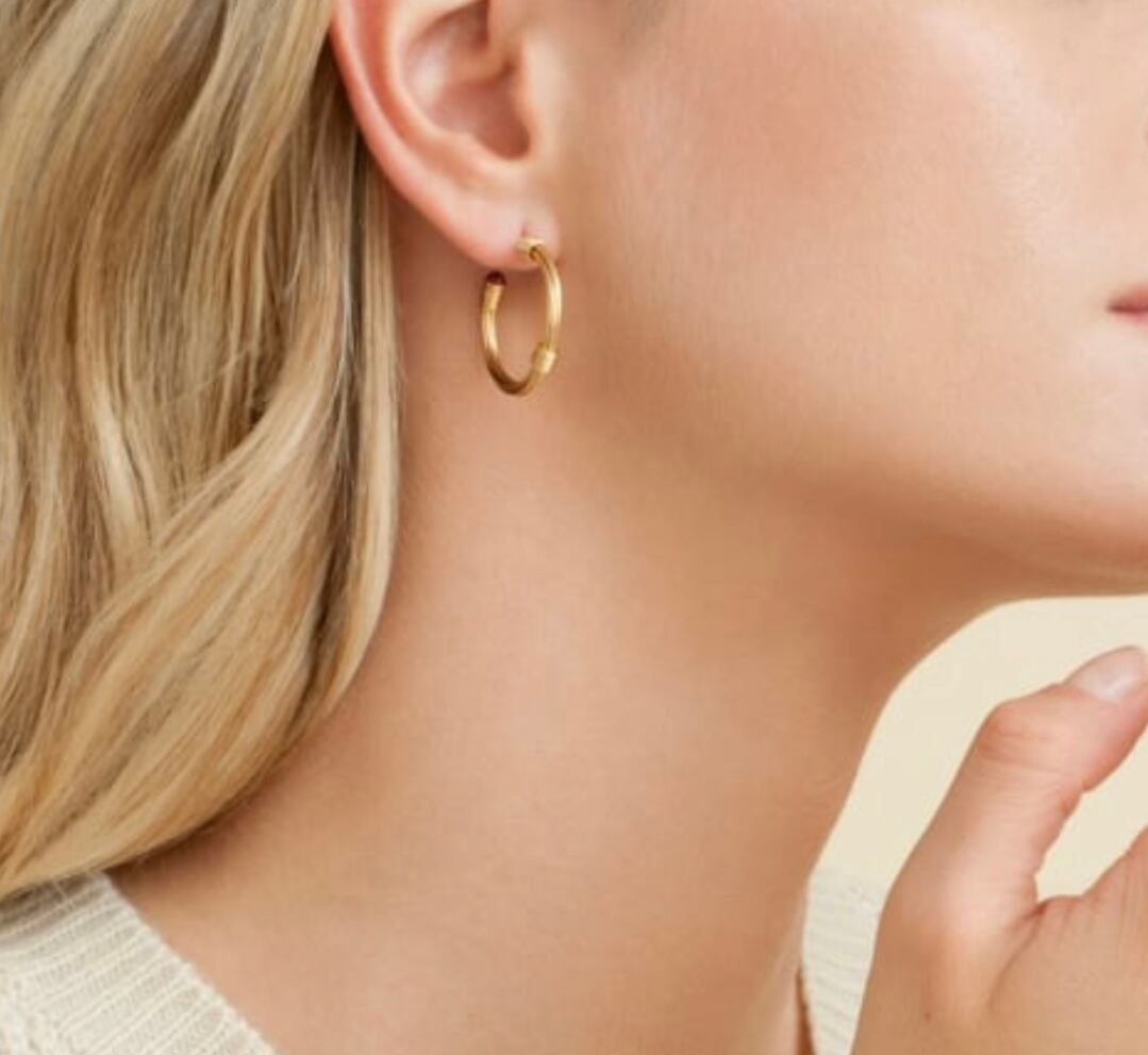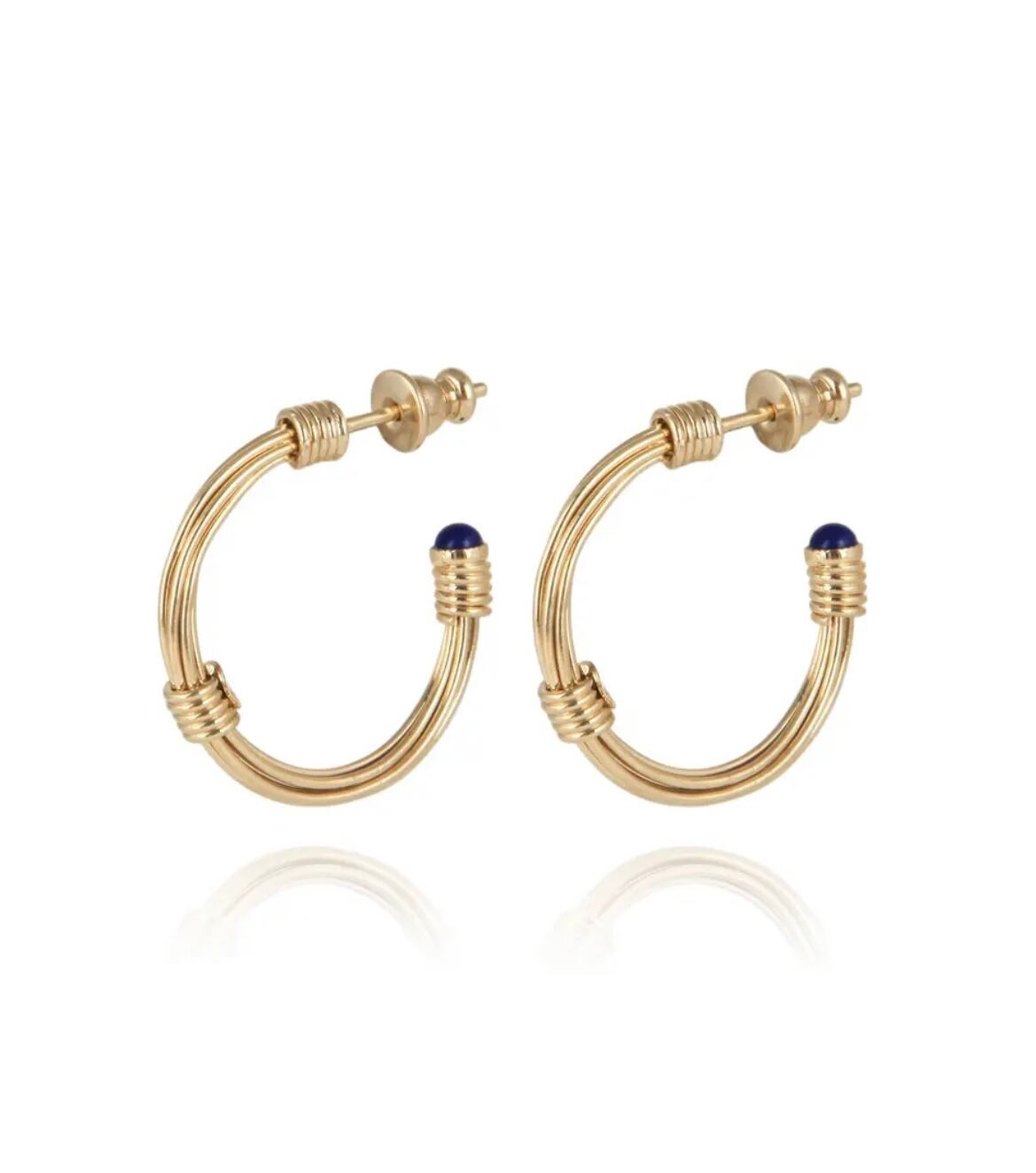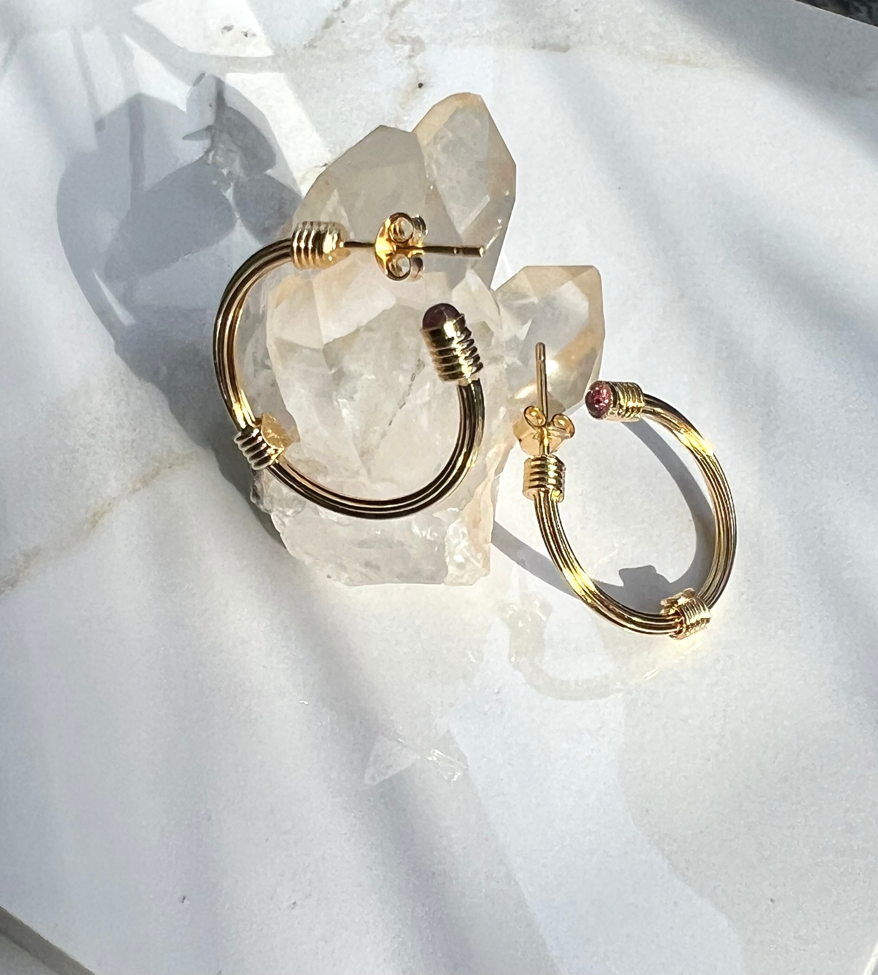 先端にアメジスト(画像2枚目の紫〜ブラウンのようなカラー)がついたフープピアス。 束を纏めたような繊細で上品なデザインです。 直径約2.3cm ポストはシルバーに24金、その他真鍮に24金です。