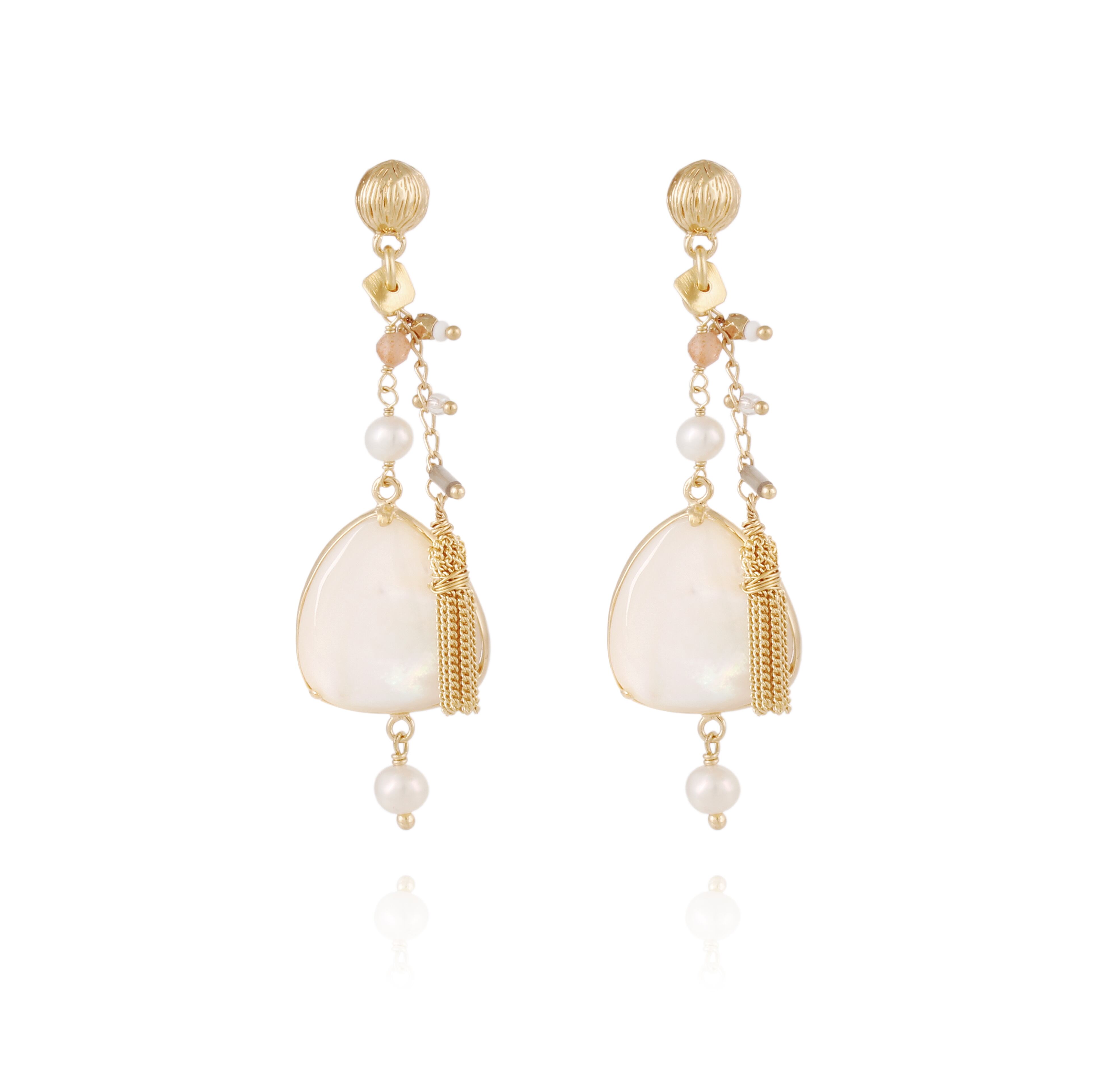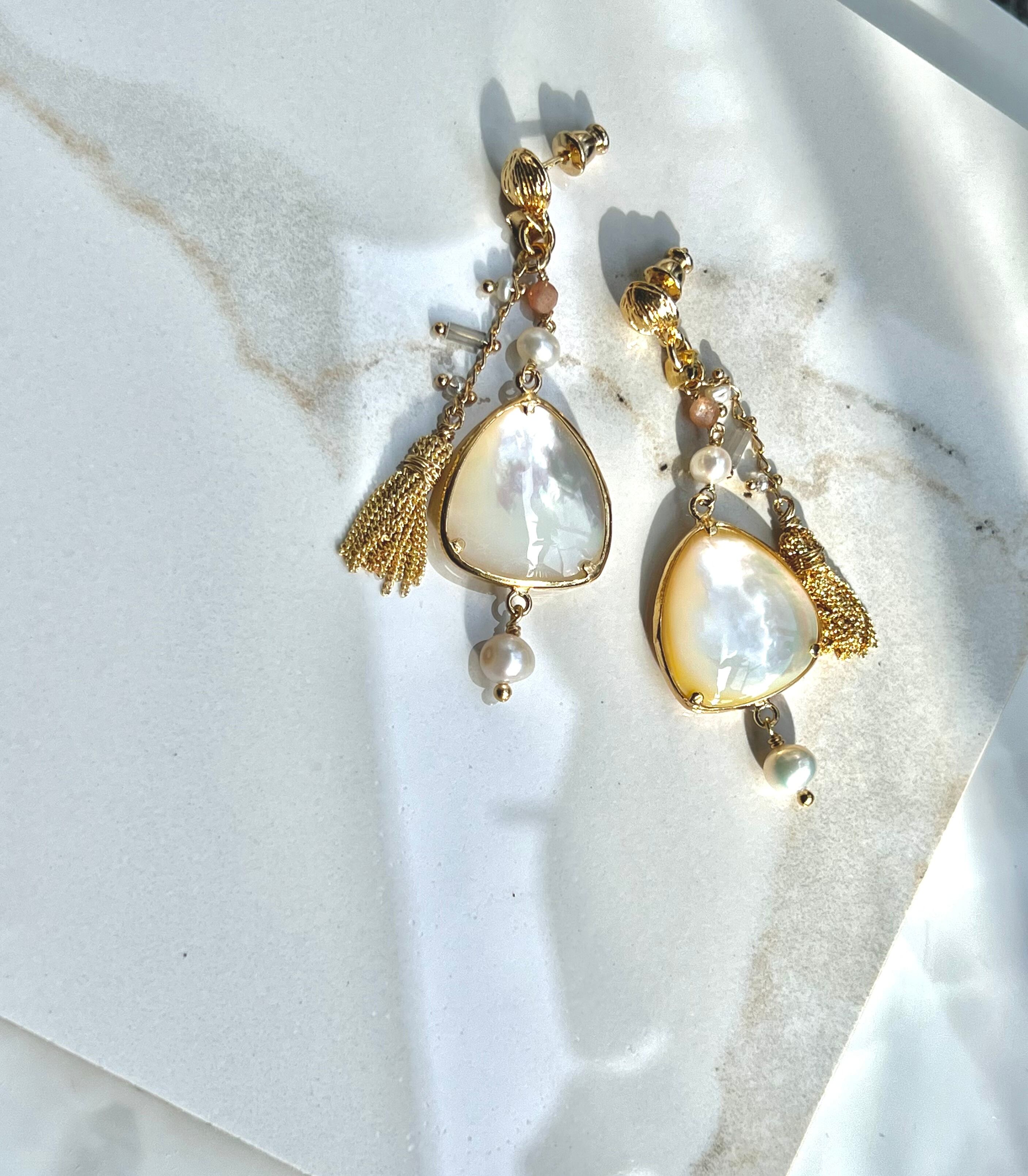 白蝶貝、ゴールドのフランジ、淡水パールやストーンの贅沢な組み合わせのピアスです。 表裏どちらも美しい白蝶貝です。 ポストはシルバーに24金、その他は真鍮に24金です。 全長約5.5cm