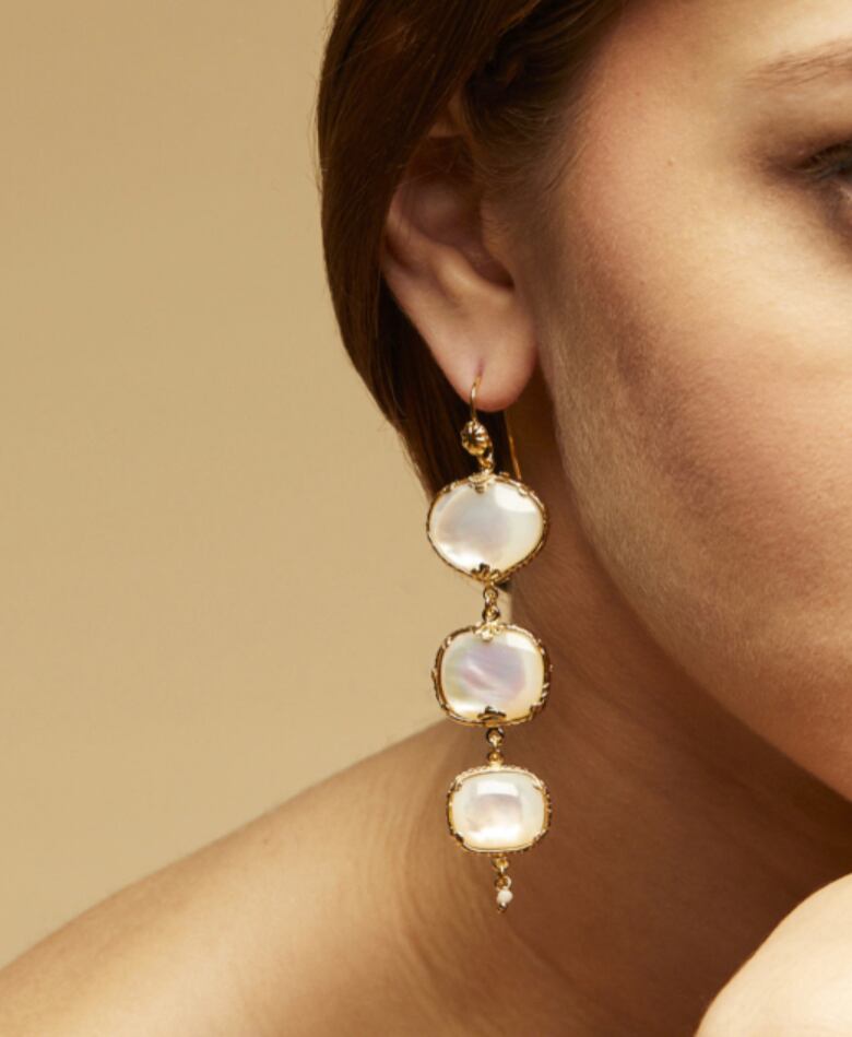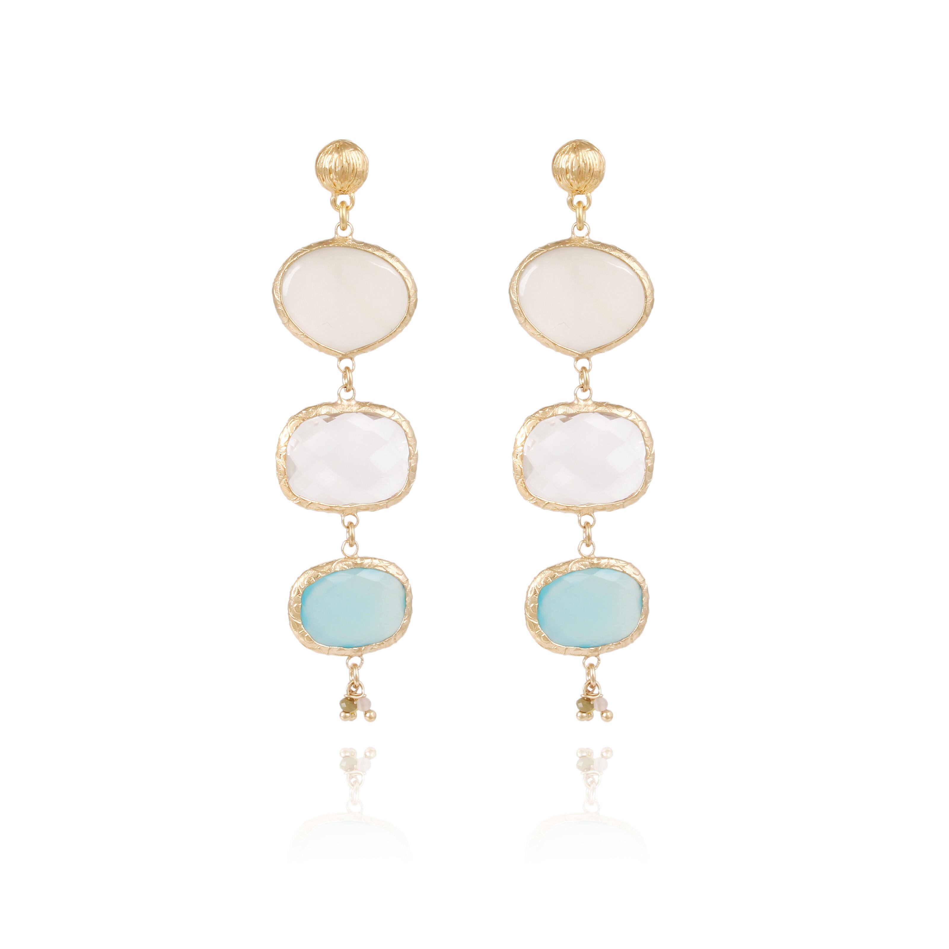 3つの天然石が連なる贅沢なピアスです。 地金は真鍮に24金コーティング。 トップ含め全長約8cmです。