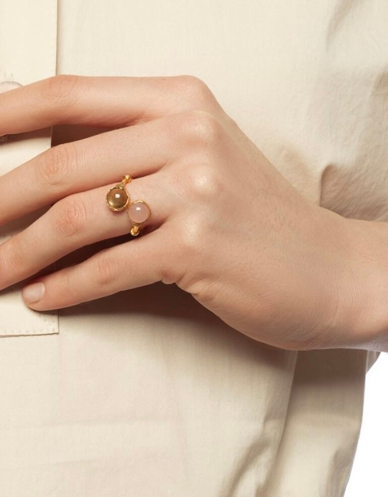 タイガーアイとシトリンの天然石のリングです。 サイズ調節可能なのでピンキーリングやお好みの指につけて頂けます。 着用画像は他カラーです。 真鍮に24金コーティングです。