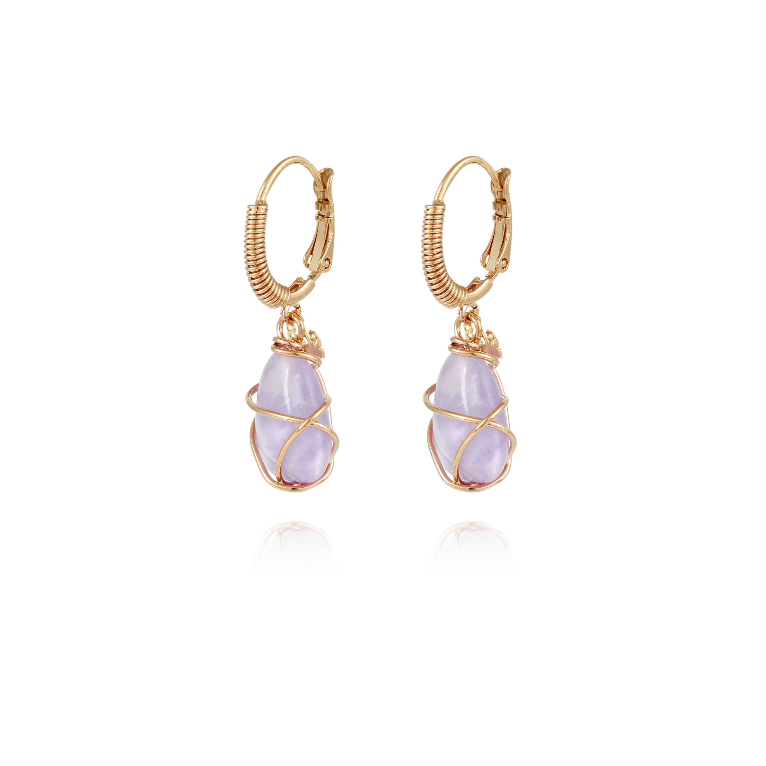 美しいパープルのアメジスト天然石のピアスです。 シンプルなデザインで天然石の美しさが際立ちます。 長さ4cm 素材:真鍮、24金 着用画像は他カラーです。