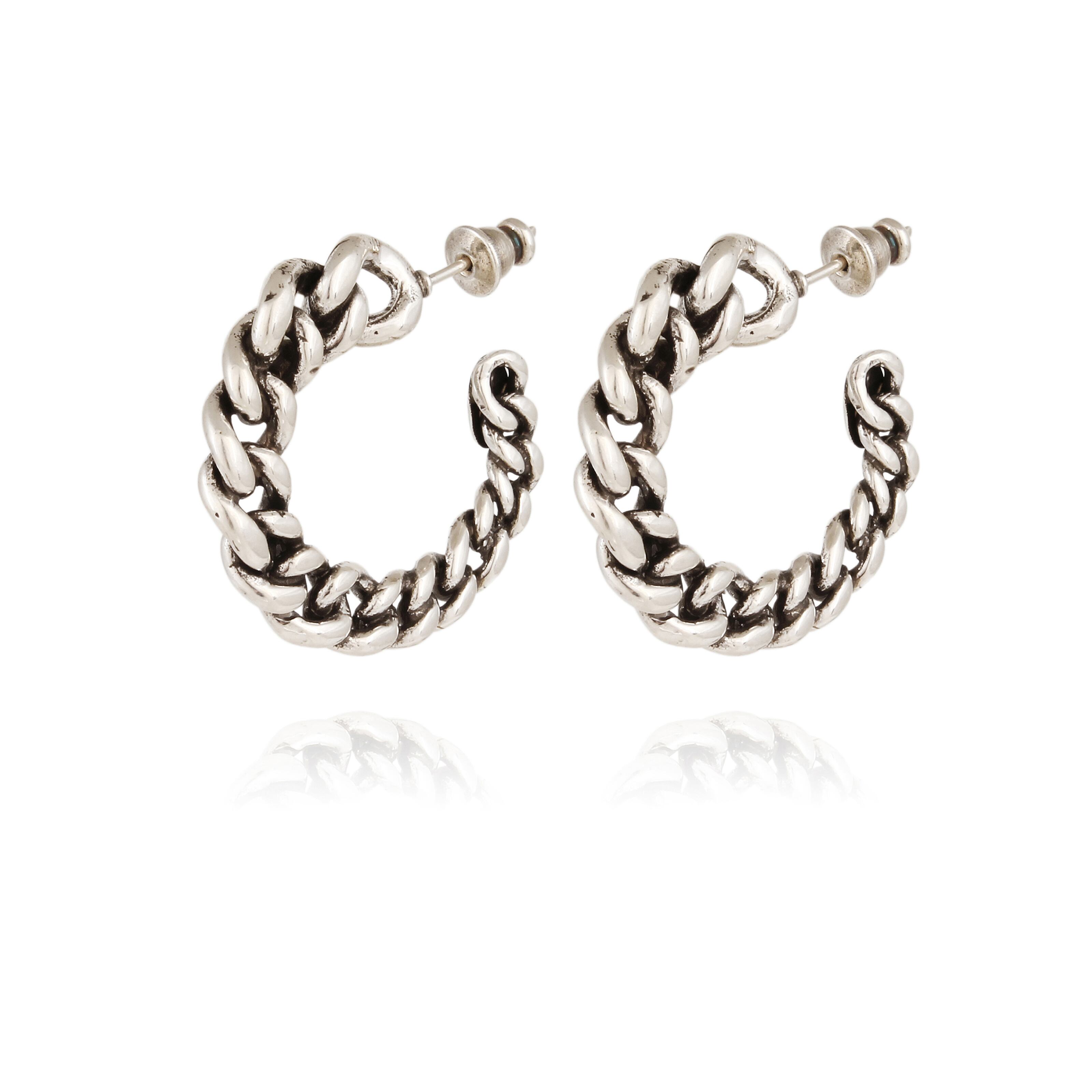 チェーンモチーフのフープピアスです。 薄くて軽やかなデザインです。 ポストはシルバー、その他は真鍮にシルバーコーティングです。 直径3cm 厚さ0.3cm