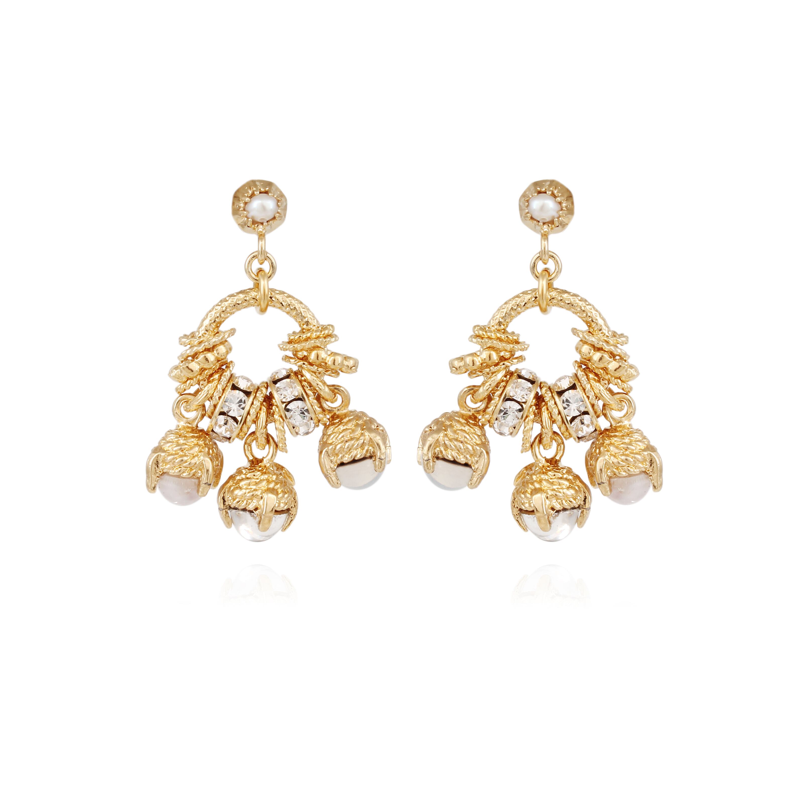 細かいディテールがそれぞれ小さく動きが出て優しく輝きます。 淡水パールやスワロフスキーが散りばめられています。 ポストはシルバーに24金、その他は真鍮に24金です。 長さ3.5cm 直径2.5cm