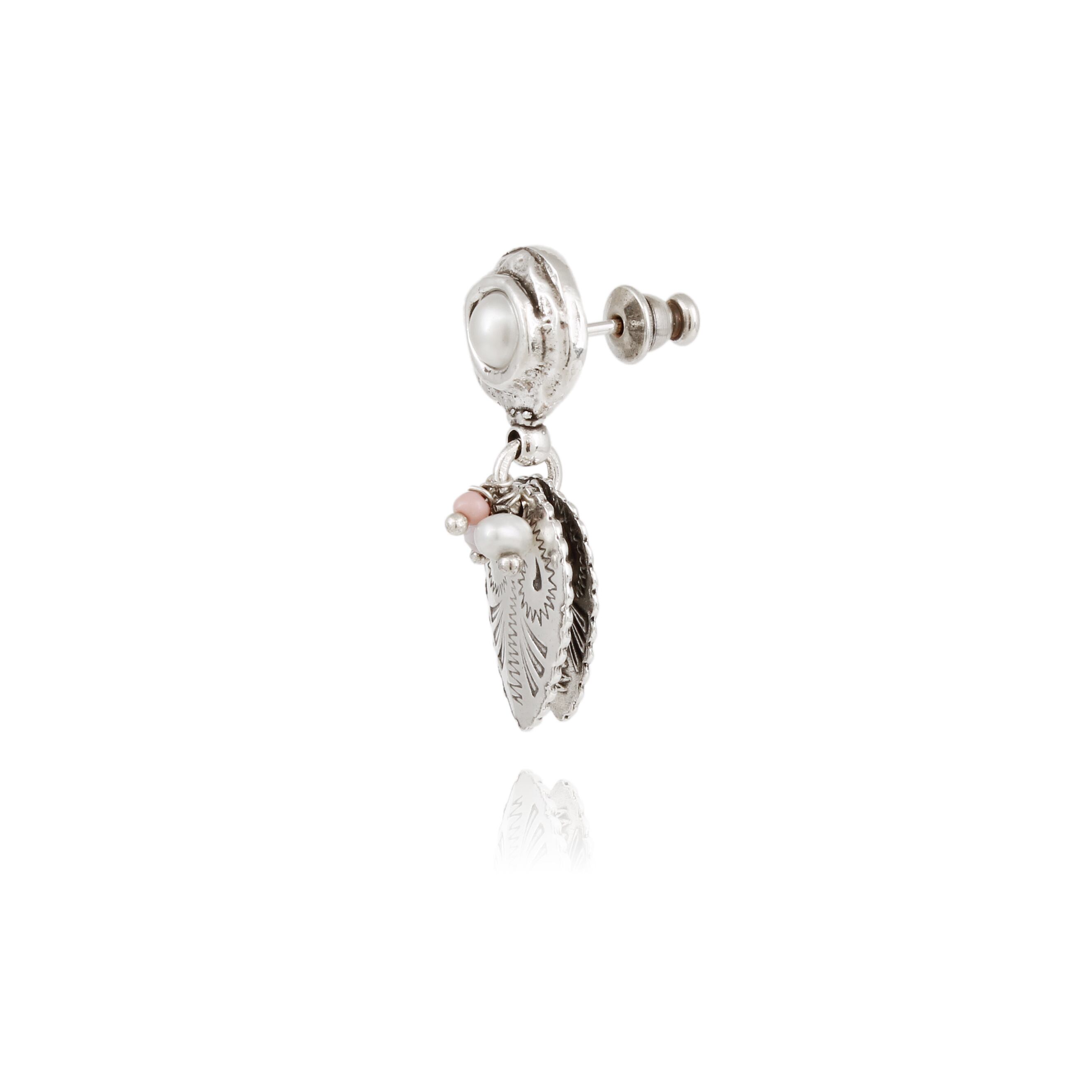 淡水パールとビーズのミックスされた葉っぱが重なったようなデザイン。 ビーズのカラーは透け感のある白です。 長さ3cm 幅1.3cm ポストはシルバー、その他は真鍮にシルバーです。