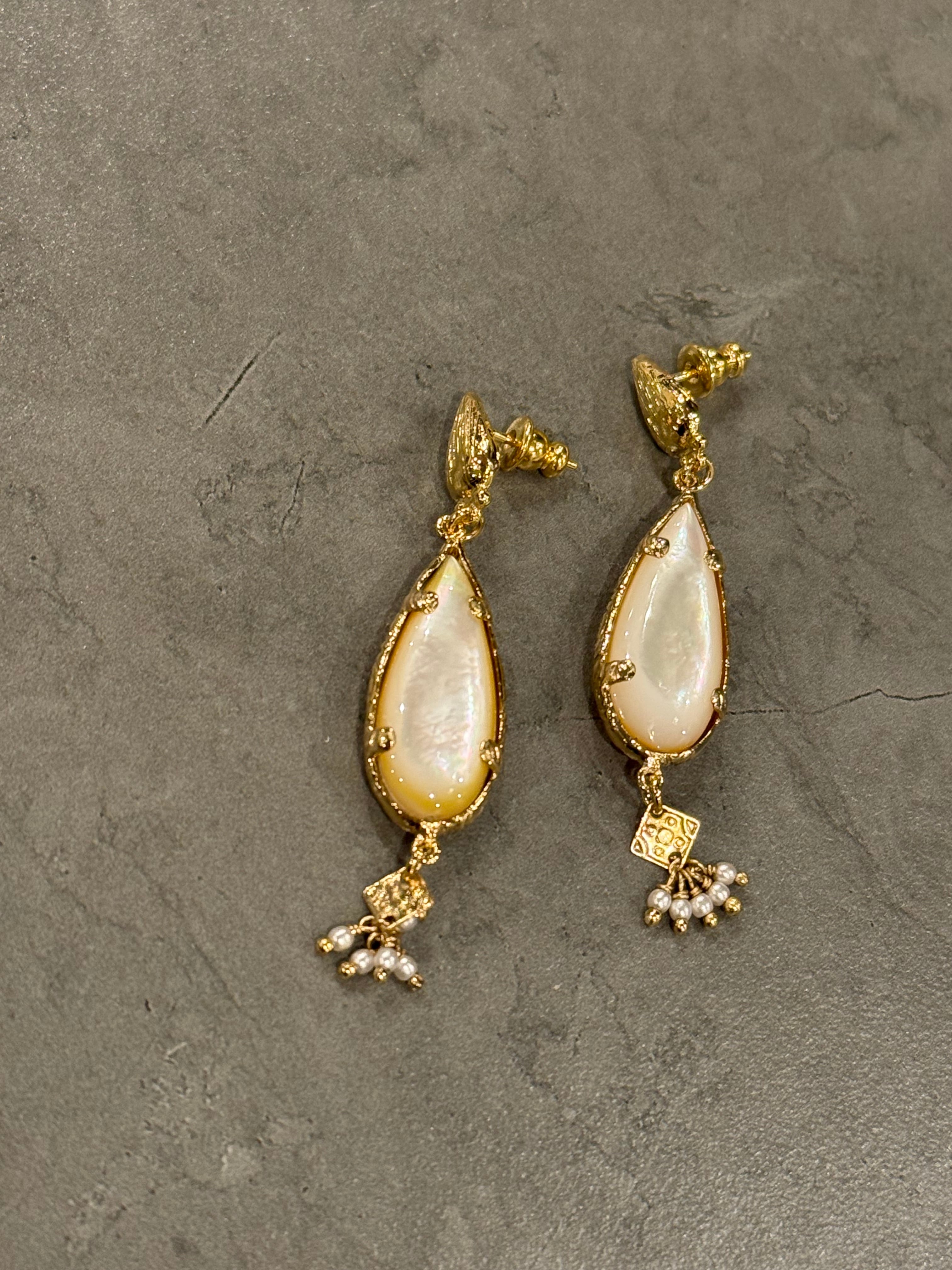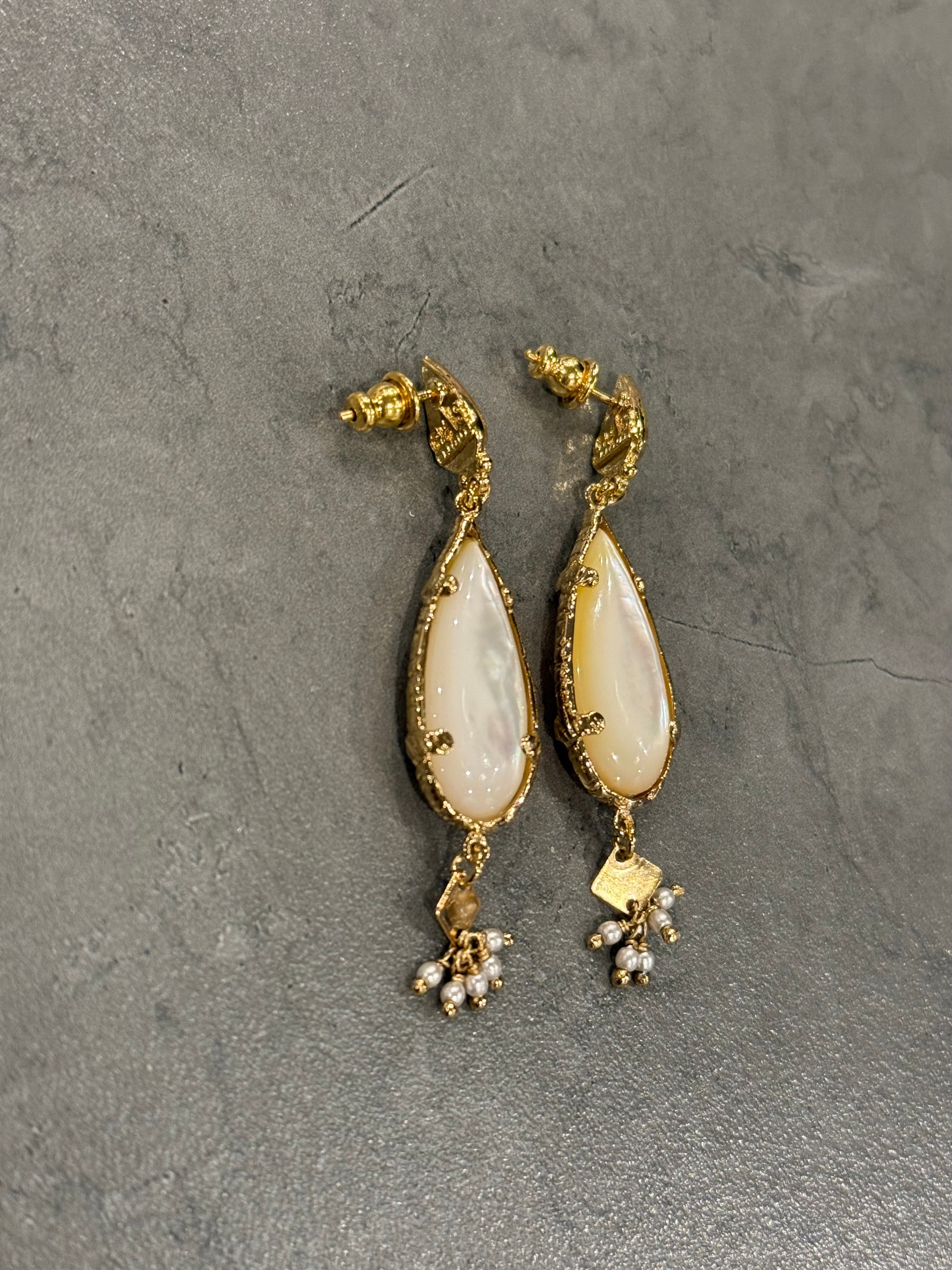 白蝶貝のピアスです。 角度によって美しく輝きます。 ポストはシルバーに24金、その他は真鍮に24金コーティングです。 石は裏表どちらも同じ見え方です。 全長約4cm 幅約1cm