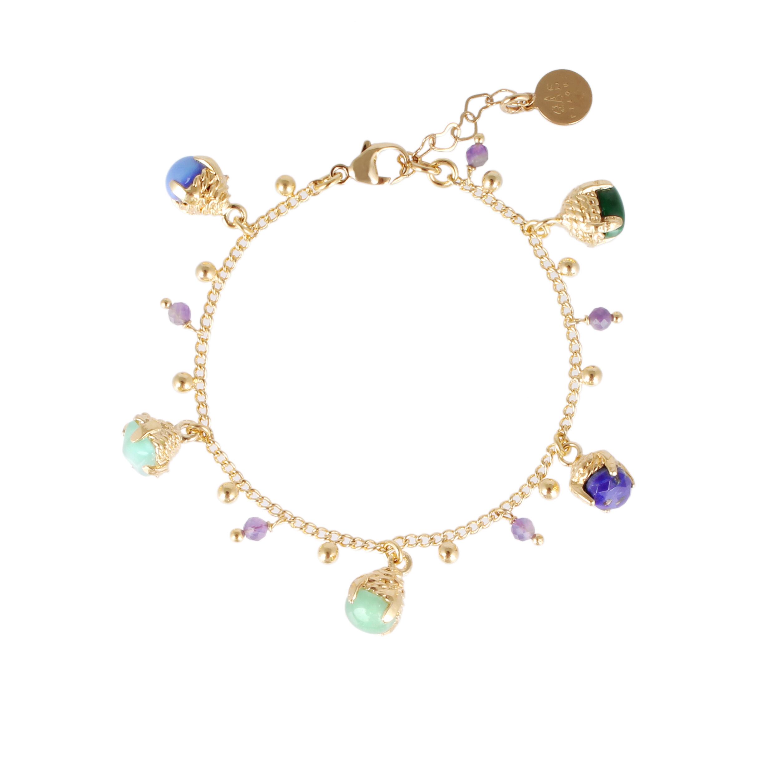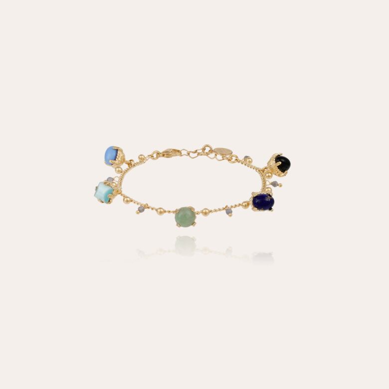 美しいグラスビーズが散りばめられたゴールドブレスレット。 360度どこから見ても可愛いデザインです。 長さ16-19cmの調節可能。 真鍮に24金です。