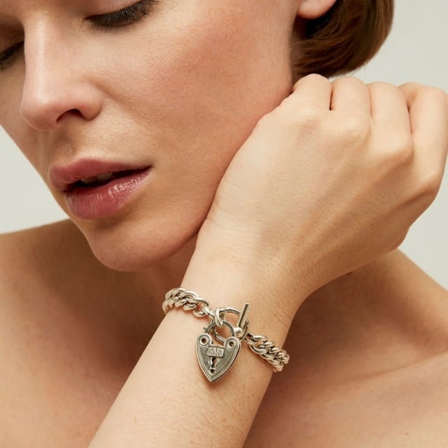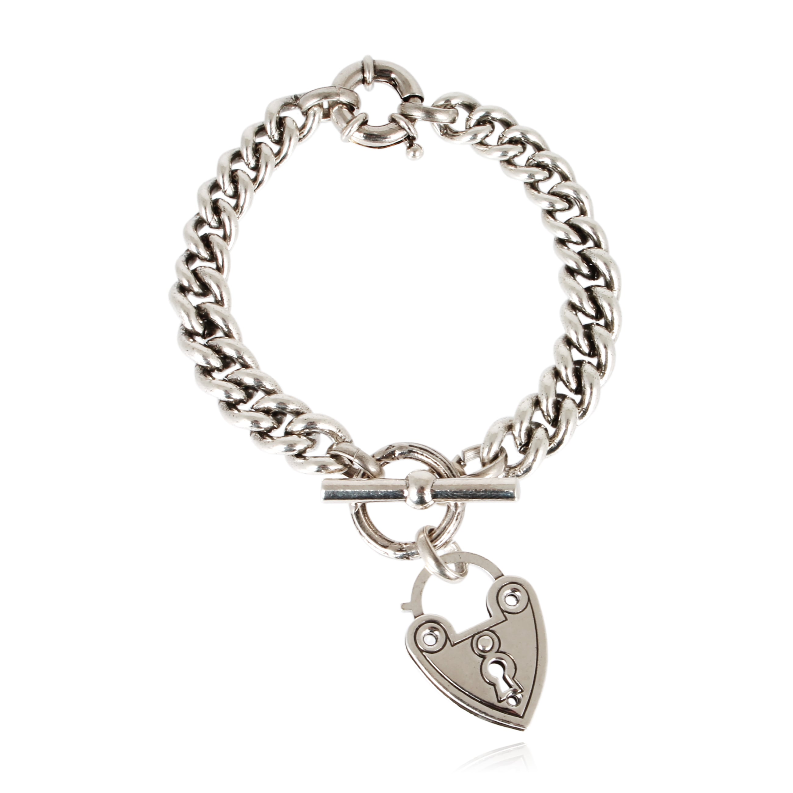 ハードなシルバーチェーンにハートのロックキーモチーフのブレスレット。 全長16.5cm ハート縦3cm 幅2.2cm 重さ29g