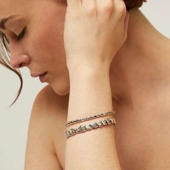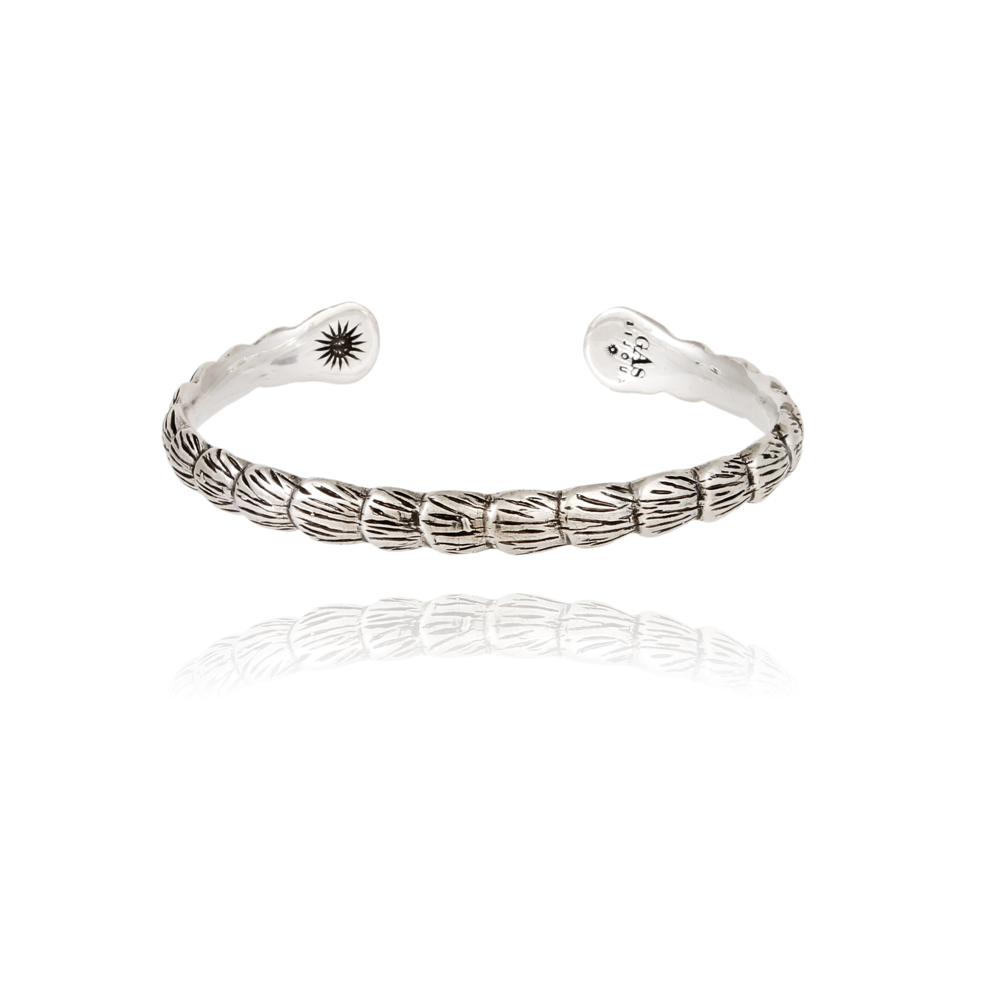 ハンドメイドで平打ち加工が施されたつる植物をモチーフとしたシルバーバングル。 ある程度調節可能です。 着用画像は太い方です。