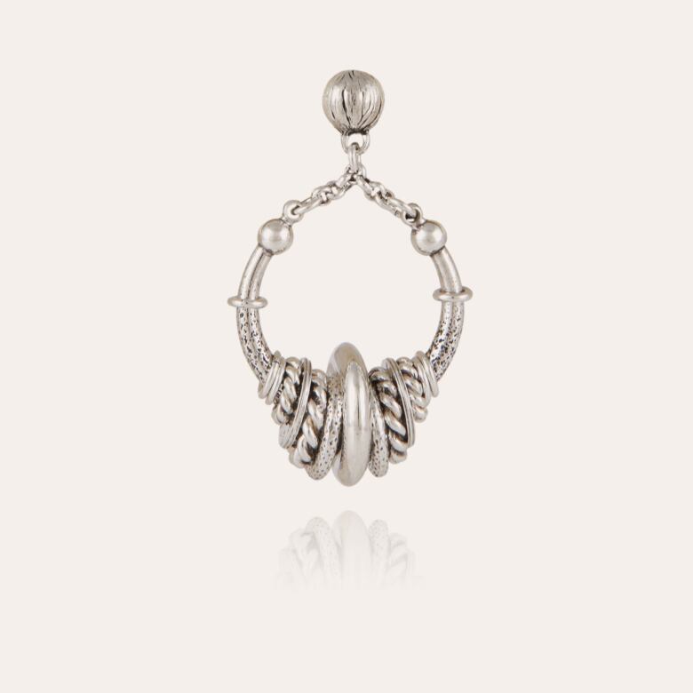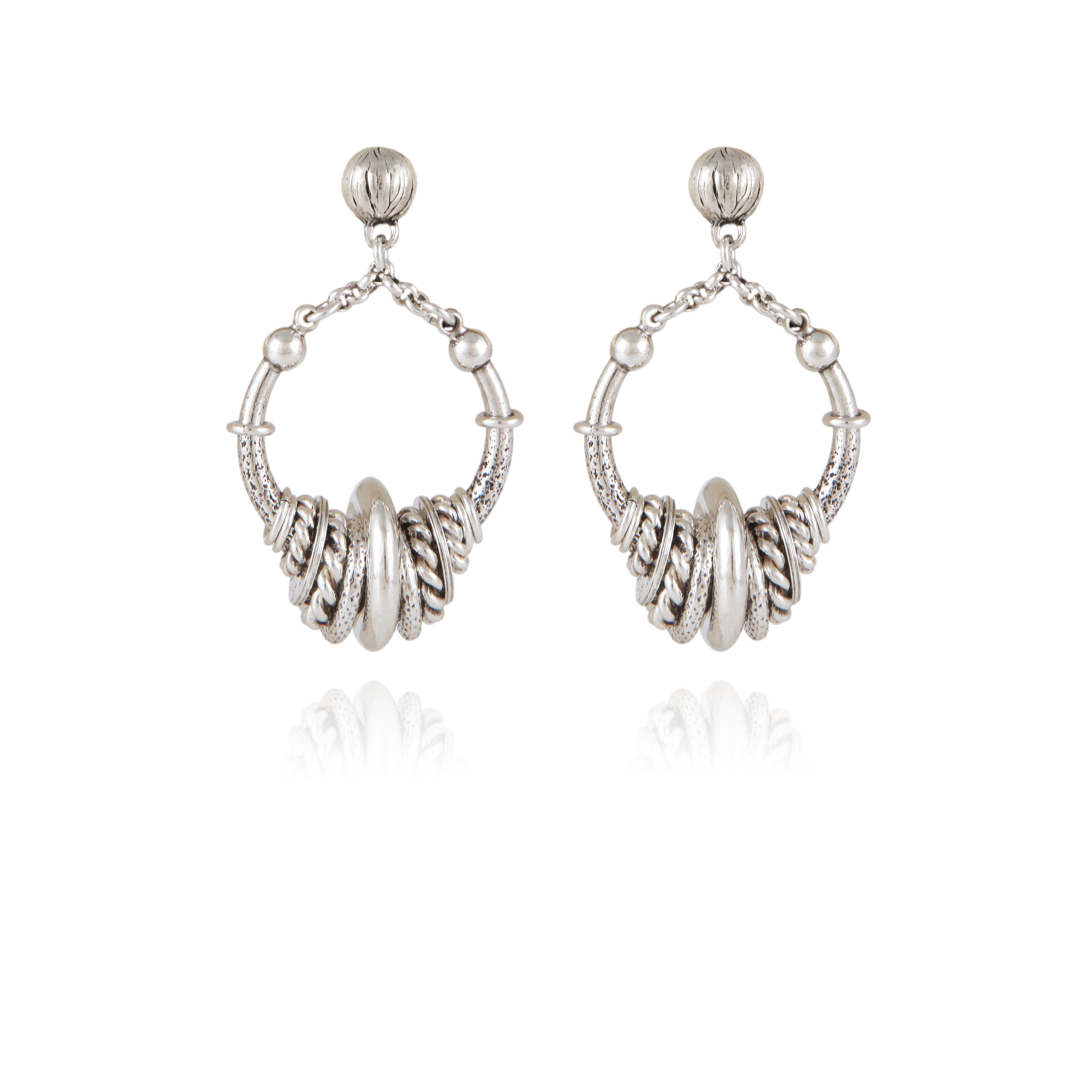 リングが幾重にも連なるデザインのシルバーピアス。 揺れると動きが出ます。 長さ4.6cm 幅2.5cm 重さ9g ポストはシルバー、その他は真鍮にシルバーコーティングです。