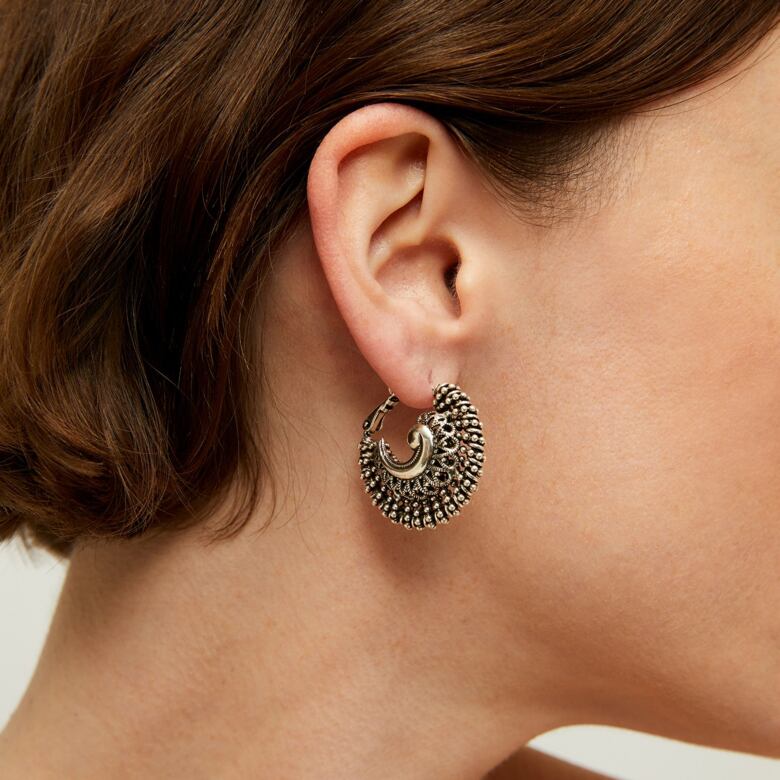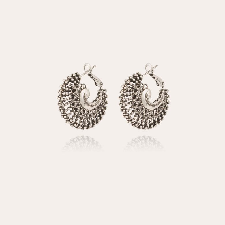 透かし細工による加工が細部まで施されています。 直径2.8cm 重さ6g 真鍮にシルバーコーティングです。