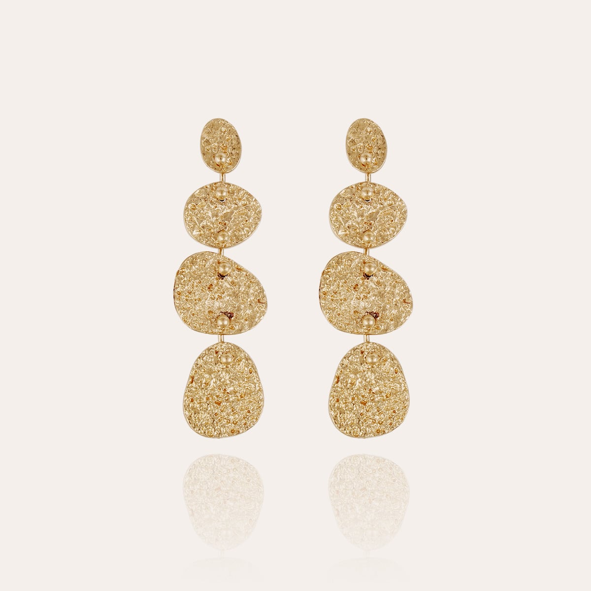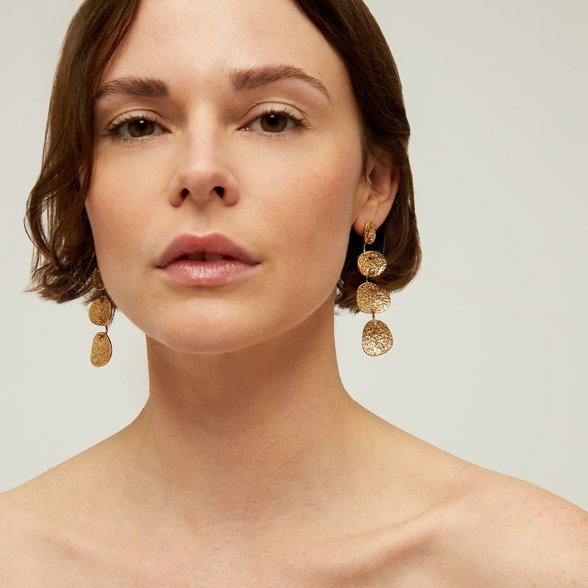 少しずつ違った楕円が4つ連なるピアス。 表面を打った加工が施されています。 長さ6.5cm 幅約2cm 重さ7g