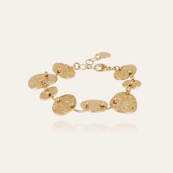 形の違った楕円が連なるブレスレット。 表面に打ち加工が施されています。 長さ14-18cm 直径約2cm 真鍮に24金コーティングです。