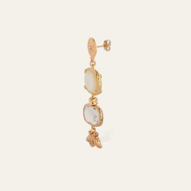 上がクリスタル、下が白蝶貝のピアスです。 長さ6.4cm 幅約1.9cm 重さ7g ポストはシルバーに24金、その他は真鍮に24金コーティングです。