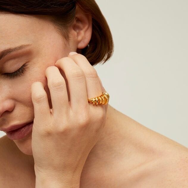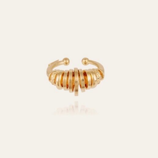 たくさんのリングが連なるデザインのゴールドリングです。 フリーサイズです。 真鍮に24金コーティングです。